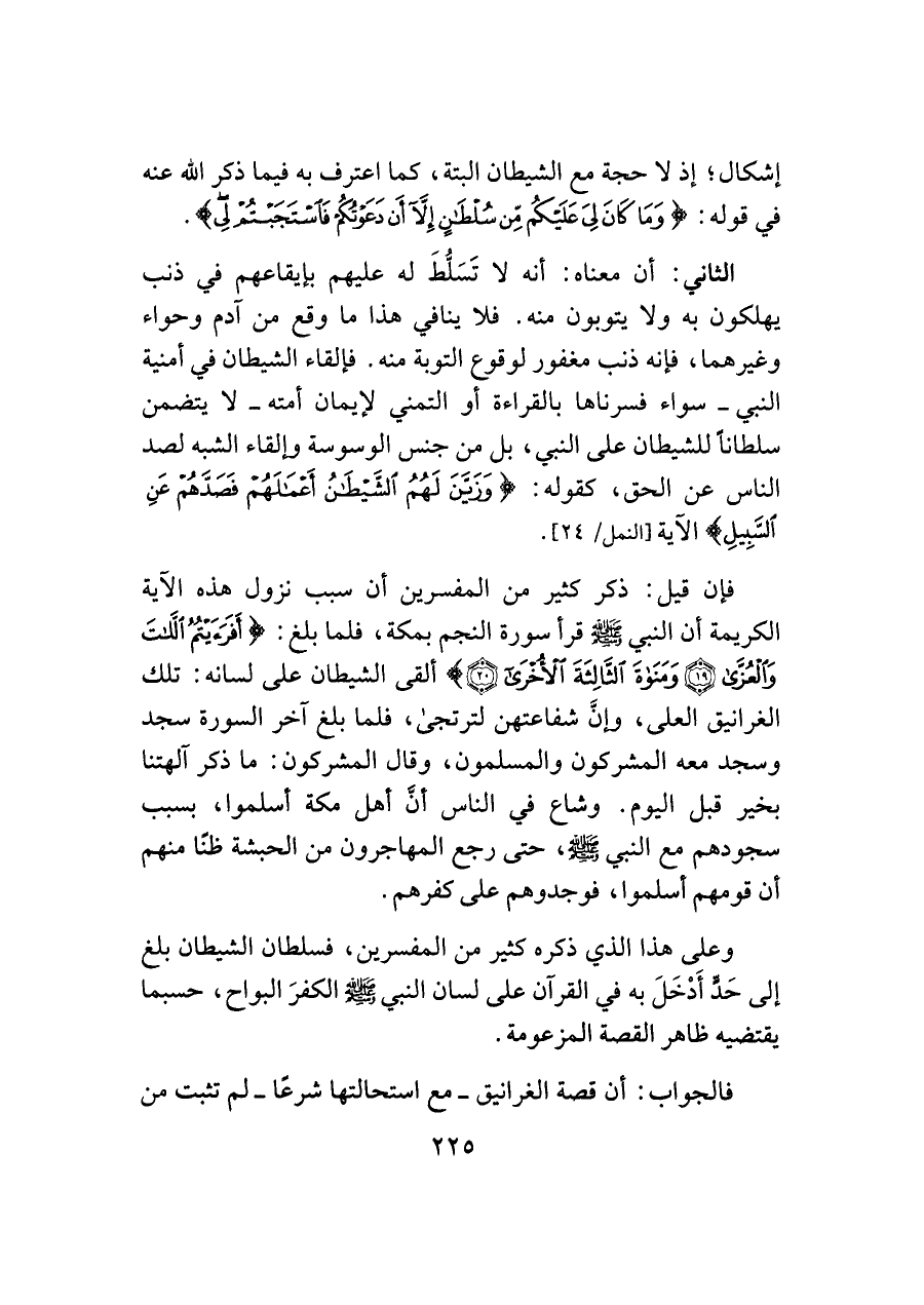 وعلى هذا الذي ذكره كثير من المفسرين، فسلطان الشيطان بلغ إلى حَدٍّ أَدْخَلَ به في القرآن على لسان النبي -صلى اللَّه عليه وسلم- الكفرَ البواح، حسبما يقتضيه ظاهر القصة المزعومة.
