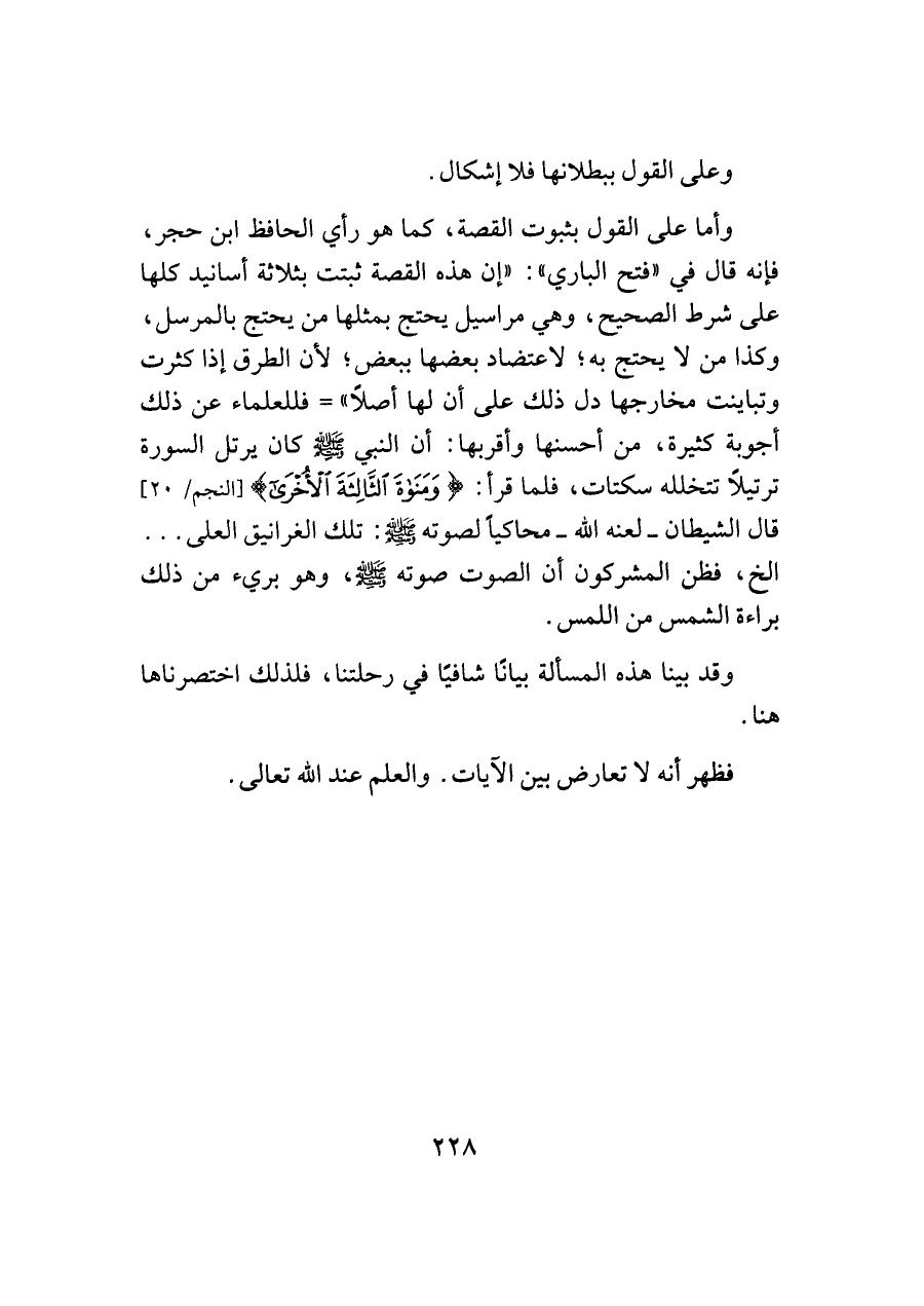 وأما على القول بثبوت القصة، كما هو رأي الحافظ ابن حجر، فإنه قال في "فتح الباري": "إن هذه القصة ثبتت بثلاثة أسانيد كلها على شرط الصحيح، وهي مراسيل يحتج بمثلها من يحتج بالمرسل، وكذا من لا يحتج به؛ لاعتضاد بعضها ببعض؛ لأن الطرق إذا كثرت وتباينت مخارجها دل ذلك على أن لها أصلًا" = فللعلماء عن ذلك أجوبة كثيرة، من أحسنها وأقربها: أن النبي -صلى اللَّه عليه وسلم- كان يرتل السورة ترتيلًا تتخلله سكتات، فلما قرأ: {وَمَنَاةَ الثَّالِثَةَ الْأُخْرَى} [النجم/ ٢٠] قال الشيطان -لعنه اللَّه- محاكيًا لصوته -صلى اللَّه عليه وسلم-: تلك الغرانيق العلى. . . الخ، فظن المشركون أن الصوت صوته -صلى اللَّه عليه وسلم-، وهو بريء من ذلك براءة الشمس من اللمس.