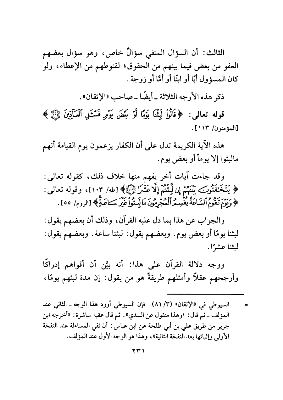 الثالث: أن السؤال المنفي سؤالٌ خاص، وهو سؤال بعضهم العفو من بعض فيما بينهم من الحقوق؛ لقنوطهم من الإعطاء، ولو كان المسؤول أبًا أو ابنًا أو أمًّا أو زوجة.