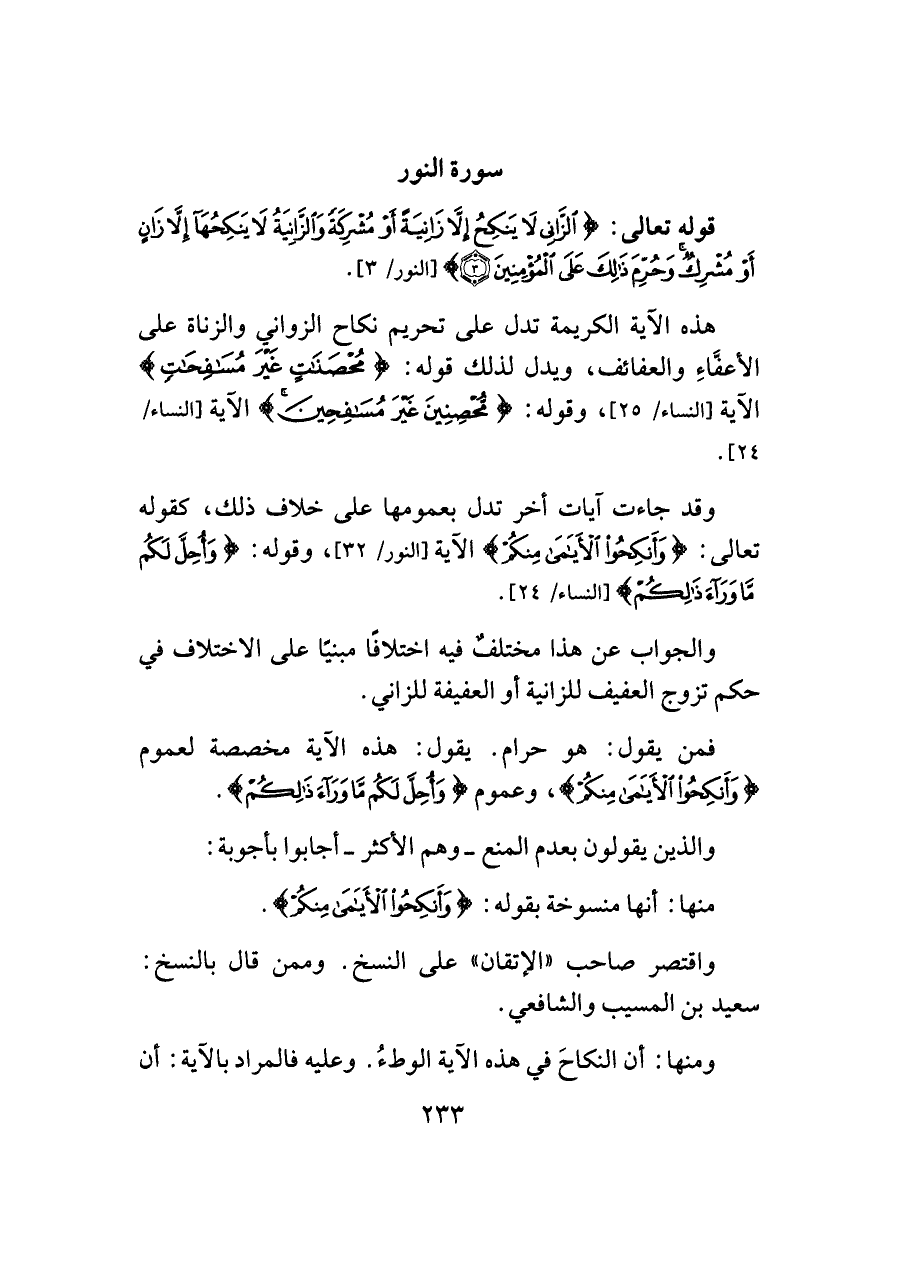 فمن يقول: هو حرام. يقول: هذه الآية مخصصة لعموم {وَأَنْكِحُوا الْأَيَامَى مِنْكُمْ}، وعموم {وَأُحِلَّ لَكُمْ مَا وَرَاءَ ذَلِكُمْ}.