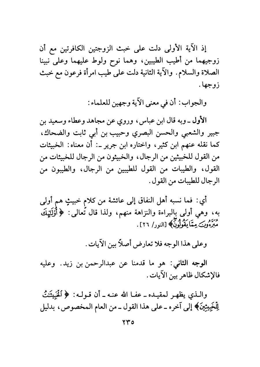 الأول -وبه قال ابن عباس، وروي عن مجاهد وعطاء وسعيد بن جبير والشعبي والحسن البصري وحبيب بن أبي ثابت والضحاك، كما نقله عنهم ابن كثير، واختاره ابن جرير-: أن معناه: الخبيثات من القول للخبيثين من الرجال، والخبيثون من الرجال للخبيثات من القول، والطيبات من القول للطيبين من الرجال، والطيبون من الرجال للطيبات من القول.
