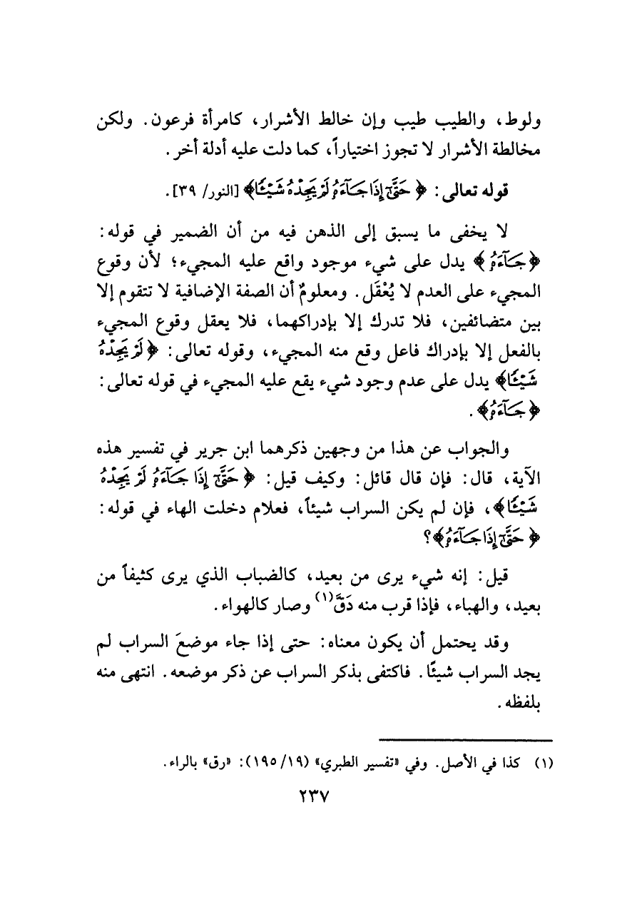 والجواب عن هذا من وجهين ذكرهما ابن جرير في تفسير هذه الآية، قال: فإن قال قائل: وكيف قيل: {حَتَّى إِذَا جَاءَهُ لَمْ يَجِدْهُ شَيْئًا}، فإن لم يكن السراب شيئًا، فعلام دخلت الهاء في قوله: {حَتَّى إِذَا جَاءَهُ}؟