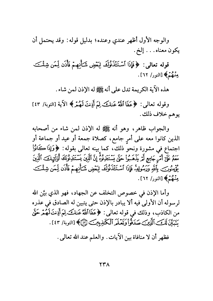 وأما الإذن في خصوص التخلف عن الجهاد، فهو الذي بيَّن اللَّه لرسوله أن الأولى فيه ألا يبادر بالإذن حتى يتبين له الصادق في عذره من الكاذب، وذلك في قوله تعالى: {عَفَا اللَّهُ عَنْكَ لِمَ أَذِنْتَ لَهُمْ حَتَّى يَتَبَيَّنَ لَكَ الَّذِينَ صَدَقُوا وَتَعْلَمَ الْكَاذِبِينَ (٤٣)} [التوبة/ ٤٣].