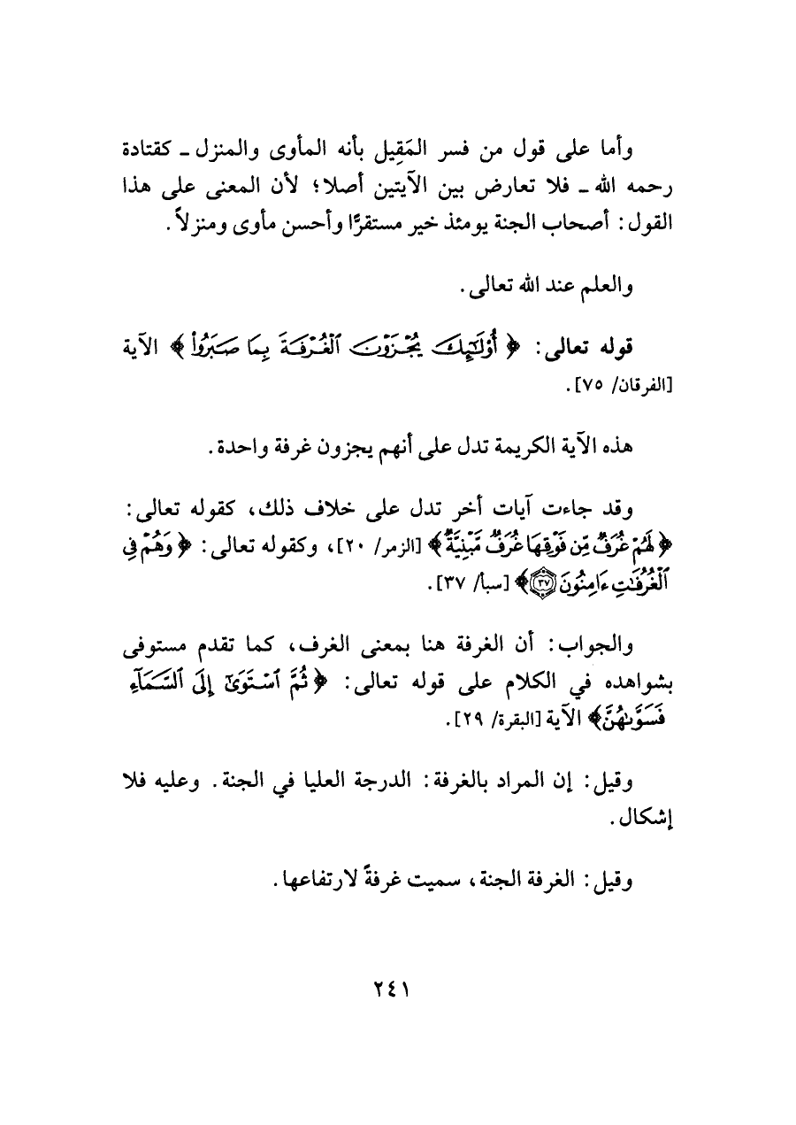 وقد جاءت آيات أخر تدل على خلاف ذلك، كقوله تعالى: {لَهُمْ غُرَفٌ مِنْ فَوْقِهَا غُرَفٌ مَبْنِيَّةٌ} [الزمر/ ٢٠]، وكقوله تعالى: {وَهُمْ فِي الْغُرُفَاتِ آمِنُونَ (٣٧)} [سبأ/ ٣٧].