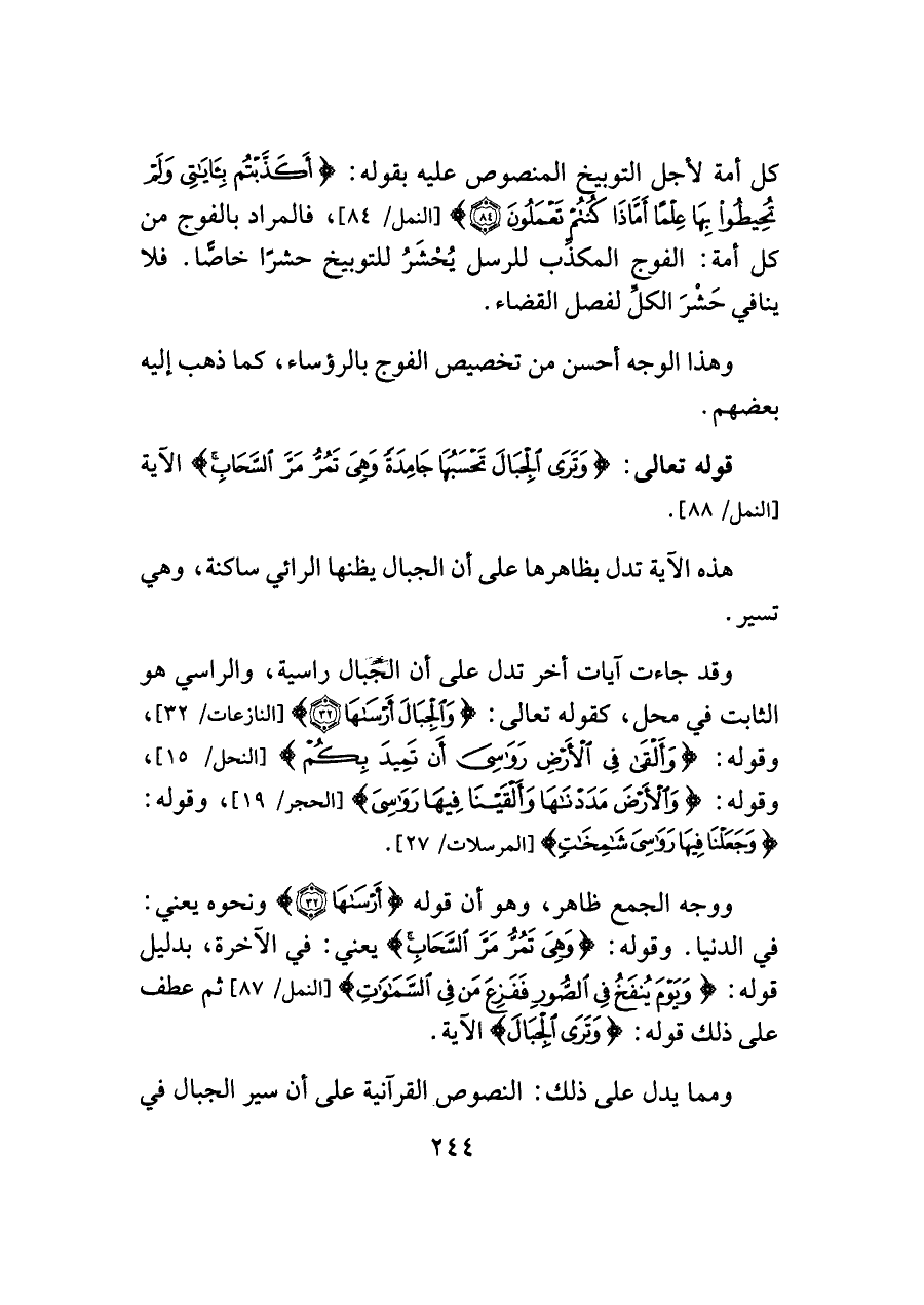 وقد جاءت آيات أخر تدل على أن الجبال راسية، والراسي هو الثابت في محل، كقوله تعالى: {وَالْجِبَالَ أَرْسَاهَا (٣٢)} [النازعات/ ٣٢]، وقوله: {وَأَلْقَى فِي الْأَرْضِ رَوَاسِيَ أَنْ تَمِيدَ بِكُمْ} [النحل/ ١٥]، وقوله: {وَالْأَرْضَ مَدَدْنَاهَا وَأَلْقَيْنَا فِيهَا رَوَاسِيَ} [الحجر/ ١٩]، وقوله: {وَجَعَلْنَا فِيهَا رَوَاسِيَ شَامِخَاتٍ} [المرسلات/ ٢٧].