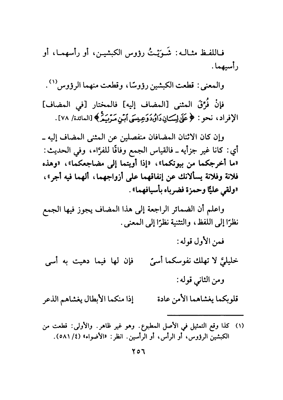 واعلم أن الضمائر الراجعة إلى هذا المضاف يجوز فيها الجمع نظرًا إلى اللفظ، والتثنية نظرًا إلى المعنى.