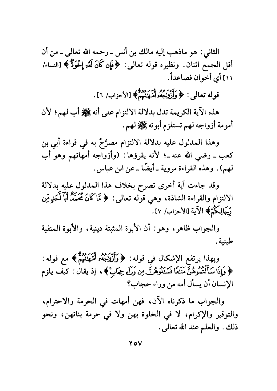 وبهذا يرتفع الإشكال في قوله: {وَأَزْوَاجُهُ أُمَّهَاتُهُمْ} مع قوله: {وَإِذَا سَأَلْتُمُوهُنَّ مَتَاعًا فَاسْأَلُوهُنَّ مِنْ وَرَاءِ حِجَابٍ}، إذ يقال: كيف يلزم الإنسان أن يسأل أمه من وراء حجاب؟