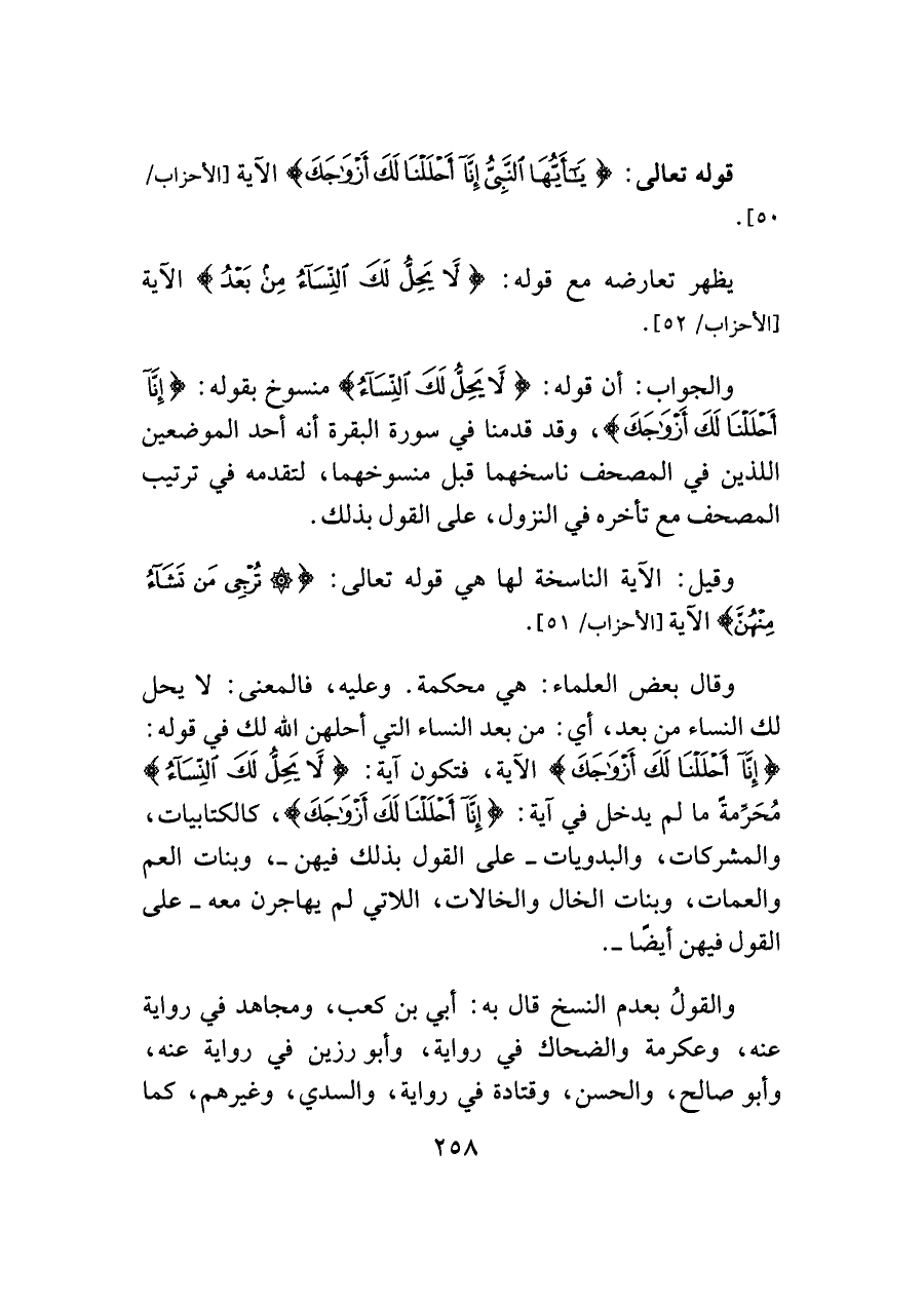 والجواب: أن قوله: {لَا يَحِلُّ لَكَ النِّسَاءُ} منسوخ بقوله: {إِنَّا أَحْلَلْنَا لَكَ أَزْوَاجَكَ}، وقد قدمنا في سورة البقرة أنه أحد الموضعين اللذين في المصحف ناسخهما قبل منسوخهما، لتقدمه في ترتيب المصحف مع تأخره في النزول، على القول بذلك.