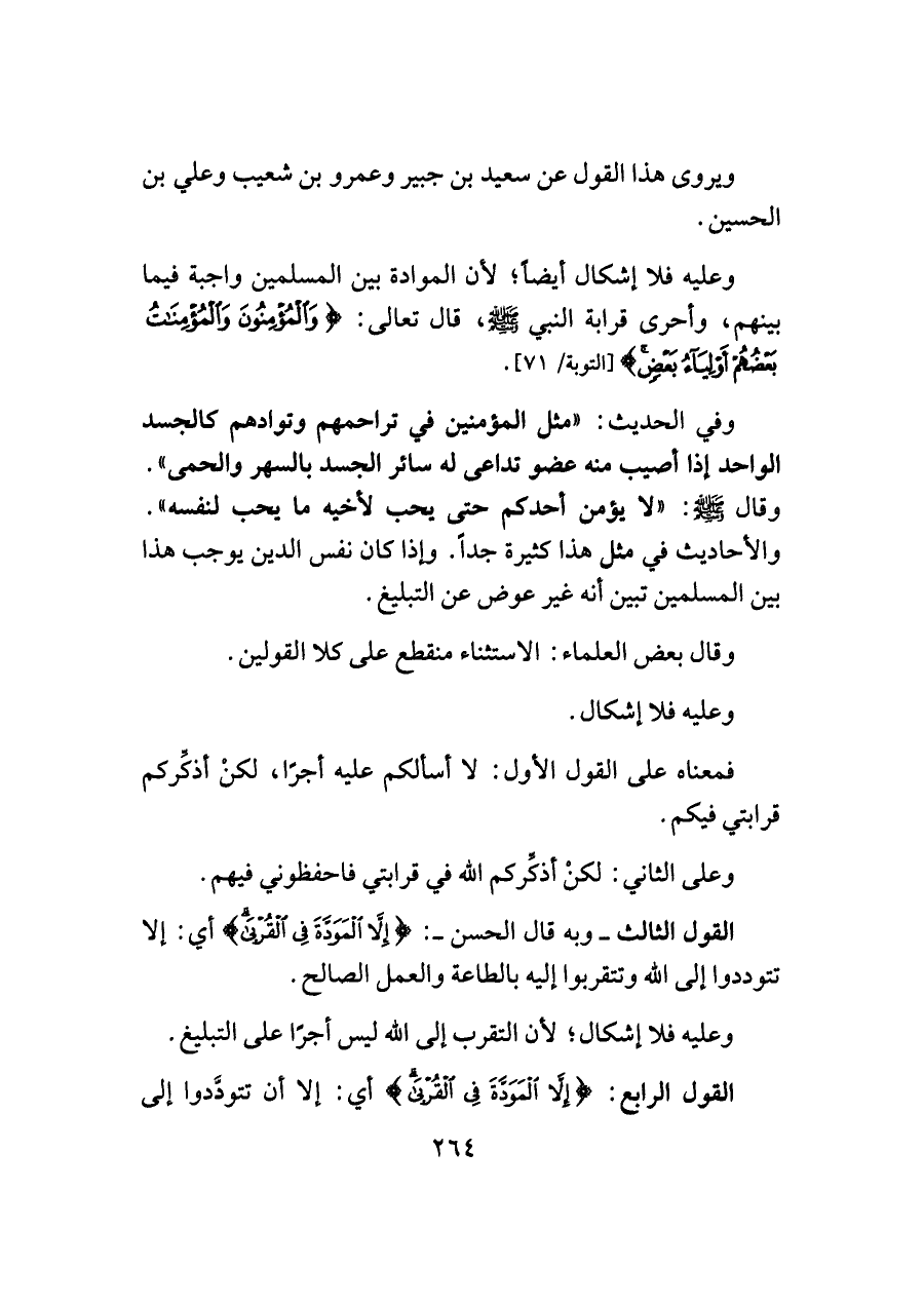 وعليه فلا إشكال أيضا؛ لأن الموادة بين المسلمين واجبة فيما بينهم، وأحرى قرابة النبي -صلى اللَّه عليه وسلم-، قال تعالى: {وَالْمُؤْمِنُونَ وَالْمُؤْمِنَاتُ بَعْضُهُمْ أَوْلِيَاءُ بَعْضٍ} [التوبة/ ٧١].