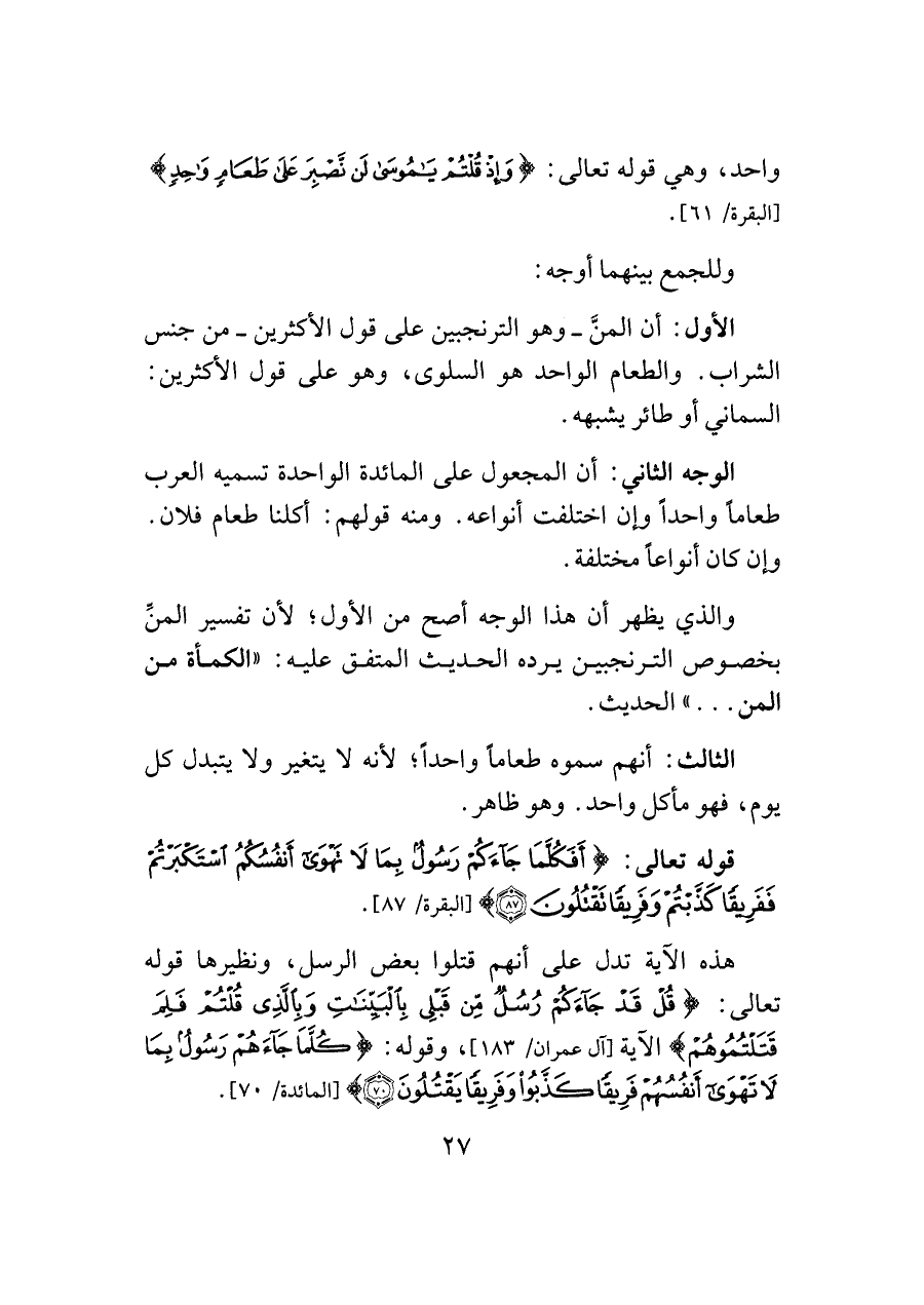 الأول: أن المنَّ -وهو الترنجبين على قول الأكثرين- من جنس الشراب. والطعام الواحد هو السلوى، وهو على قول الأكثرين: السماني أو طائر يشبهه.