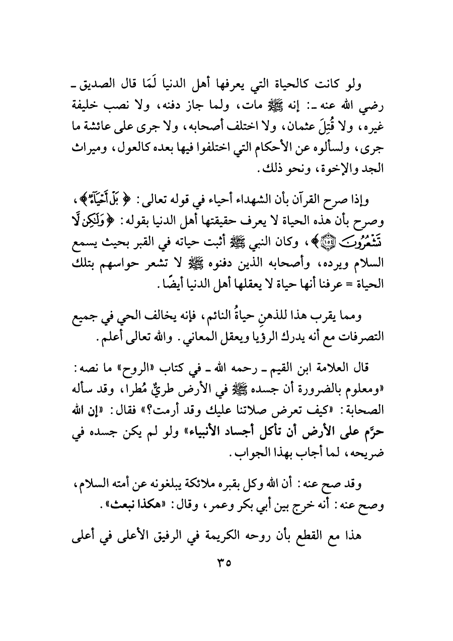 ولو كانت كالحياة التي يعرفها أهل الدنيا لَمَا قال الصديق -رضي اللَّه عنه-: إنه -صلى اللَّه عليه وسلم- مات، ولما جاز دفنه، ولا نصب خليفة غيره، ولا قُتِلَ عثمان، ولا اختلف أصحابه، ولا جرى على عائشة ما جرى، ولسألوه عن الأحكام التي اختلفوا فيها بعده كالعول، وميراث الجد والإخوة، ونحو ذلك.