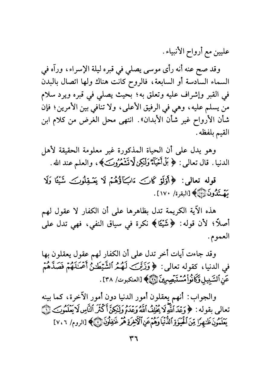 وقد صح عنه أنه رأى موسى يصلي في قبره ليلة الإسراء، ورآه في السماء السادسة أو السابعة، فالروح كانت هناك ولها اتصال بالبدن في القبر وإشراف عليه وتعلق به؛ بحيث يصلي في قبره ويرد سلام من يسلم عليه، وهي في الرفيق الأعلى، ولا تنافي بين الأمرين؛ فإن شأن الأرواح غير شأن الأبدان". انتهى محل الغرض من كلام ابن القيم بلفظه.