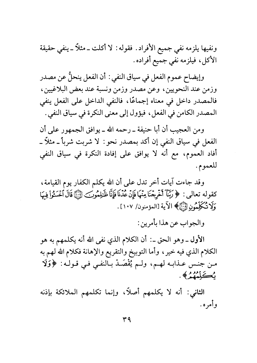 وقد جاءت آيات أخر تدل على أن اللَّه يكلم الكفار يوم القيامة، كقوله تعالى: {رَبَّنَا أَخْرِجْنَا مِنْهَا فَإِنْ عُدْنَا فَإِنَّا ظَالِمُونَ (١٠٧) قَالَ اخْسَئُوا فِيهَا وَلَا تُكَلِّمُونِ (١٠٨)} الآية [المؤمنون/ ١٠٧].