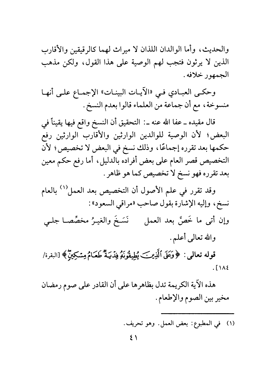قال مقيده -عفا اللَّه عنه-: التحقيق أن النسخ واقع فيها يقينًا في البعض؛ لأن الوصية للوالدين الوارثين والأقارب الوارثين رفع حكمها بعد تقرره إجماعًا، وذلك نسخ في البعض لا تخصيص؛ لأن التخصيص قصر العام على بعض أفراده بالدليل، أما رفع حكم معين بعد تقرره فهو نسخ لا تخصيص كما هو ظاهر.