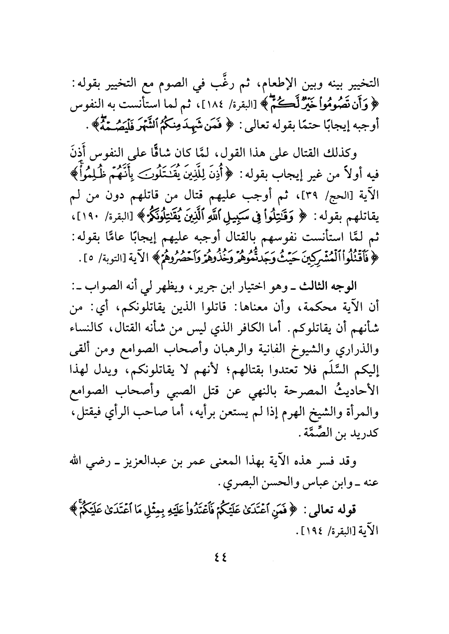 الوجه الثالث -وهو اختيار ابن جرير، ويظهر لي أن الصواب-: أن الآية محكمة، وأن معناها: قاتلوا الذين يقاتلونكم، أي: من شأنهم أن يقاتلوكم. أما الكافر الذي ليس من شأنه القتال، كالنساء والذراري والشيوخ الفانية والرهبان وأصحاب الصوامع ومن ألقى إليكم السَّلَم فلا تعتدوا بقتالهم؛ لأنهم لا يقاتلونكم، ويدل لهذا الأحاديثُ المصرحة بالنهي عن قتل الصبي وأصحاب الصوامع والمرأة والشيخ الهرم إذا لم يستعن برأيه، أما صاحب الرأي فيقتل، كدريد بن الصِّمَّة.