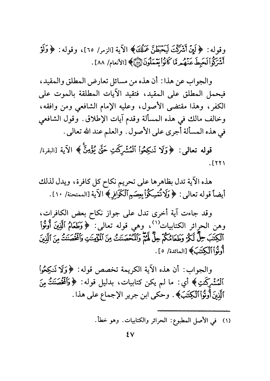 والجواب عن هذا: أن هذه من مسائل تعارض المطلق والمقيد، فيحمل المطلق على المقيد، فتقيد الآيات المطلقة بالموت على الكفر، وهذا مقتضى الأصول، وعليه الإمام الشافعي ومن وافقه، وخالف مالك في هذه المسألة وقدم آيات الإطلاق. وقول الشافعي في هذه المسألة أجرى على الأصول. والعلم عند اللَّه تعالى.