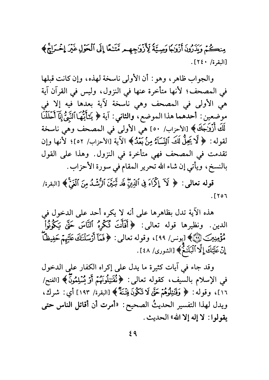 قوله تعالى: {لَا إِكْرَاهَ فِي الدِّينِ قَدْ تَبَيَّنَ الرُّشْدُ مِنَ الْغَيِّ} [البقرة/ ٢٥٦].