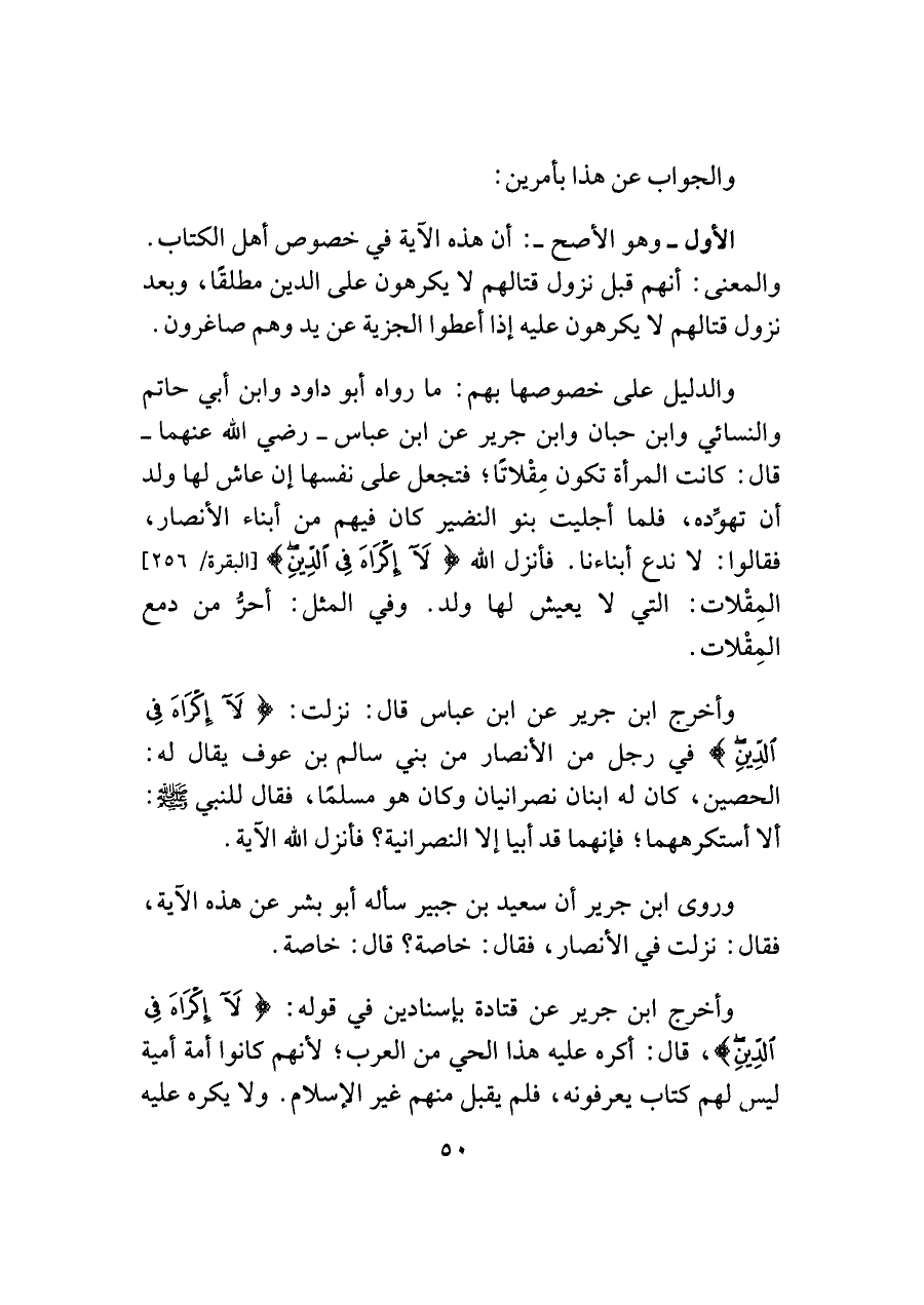الأول -وهو الأصح-: أن هذه الآية في خصوص أهل الكتاب. والمعنى: أنهم قبل نزول قتالهم لا يكرهون على الدين مطلقًا، وبعد نزول قتالهم لا يكرهون عليه إذا أعطوا الجزية عن يد وهم صاغرون.