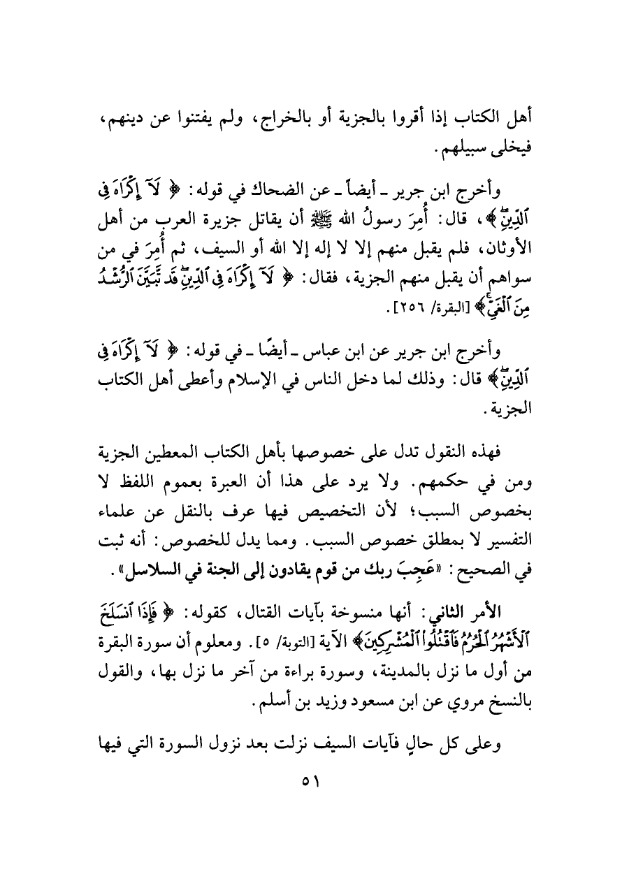 وأخرج ابن جرير -أيضًا- عن الضحاك في قوله: {لَا إِكْرَاهَ فِي الدِّينِ} و، قال: أُمِرَ رسولُ اللَّه -صلى اللَّه عليه وسلم- أن يقاتل جزيرة العرب من أهل الأوثان، فلم يقبل منهم إلا لا إله إلا اللَّه أو السيف، ثم أُمِرَ في من سواهم أن يقبل منهم الجزية، فقال: {لَا إِكْرَاهَ فِي الدِّينِ قَدْ تَبَيَّنَ الرُّشْدُ مِنَ الْغَيِّ} [البقرة/ ٢٥٦].
