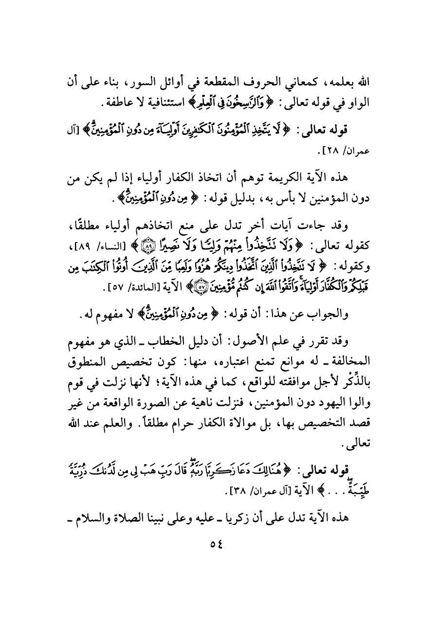 قوله تعالى: {لَا يَتَّخِذِ الْمُؤْمِنُونَ الْكَافِرِينَ أَوْلِيَاءَ مِنْ دُونِ الْمُؤْمِنِينَ} [آل عمران/ ٢٨].