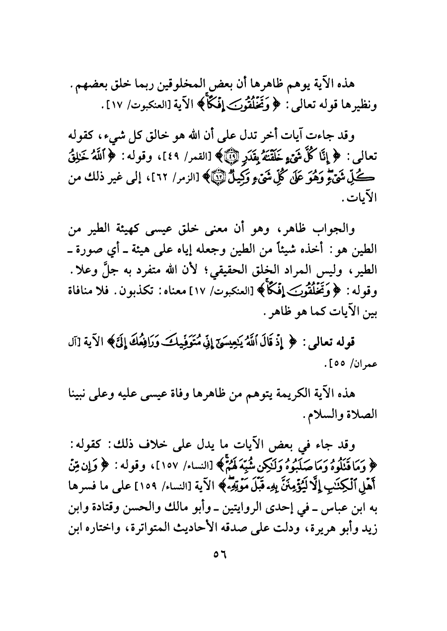 والجواب ظاهر، وهو أن معنى خلق عيسى كهيئة الطير من الطين هو: أخذه شيئًا من الطين وجعله إياه على هيئة -أي صورة- الطير، وليس المراد الخلق الحقيقي؛ لأن اللَّه متفرد به جلَّ وعلا. وقو له: {وَتَخْلُقُونَ إِفْكًا} [العنكبوت/ ١٧] معناه: تكذبون. فلا منافاة بين الآيات كما هو ظاهر.