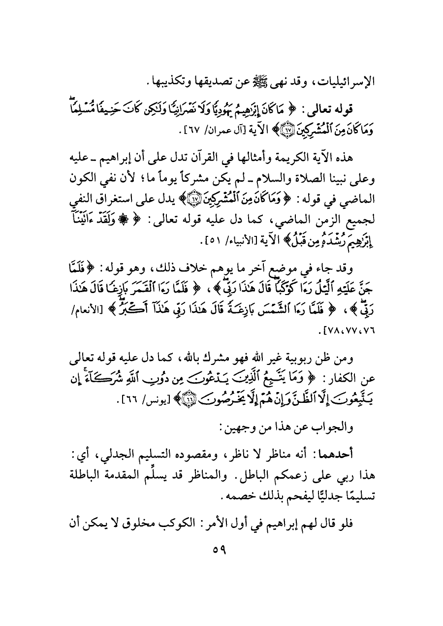 قوله تعالى: {مَا كَانَ إِبْرَاهِيمُ يَهُودِيًّا وَلَا نَصْرَانِيًّا وَلَكِنْ كَانَ حَنِيفًا مُسْلِمًا وَمَا كَانَ مِنَ الْمُشْرِكِينَ (٦٧)} الآية [آل عمران/ ٦٧].