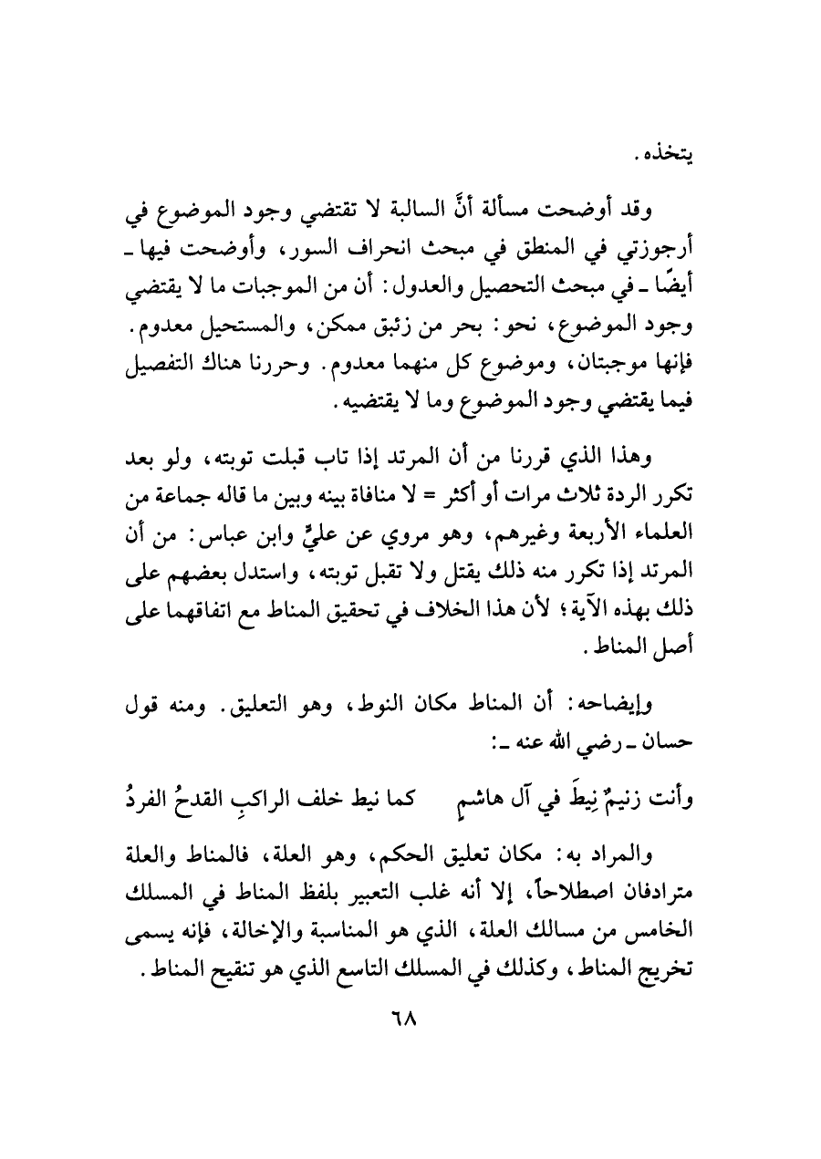 وإيضاحه: أن المناط مكان النوط، وهو التعليق. ومنه قول حسان -رضي اللَّه عنه-: