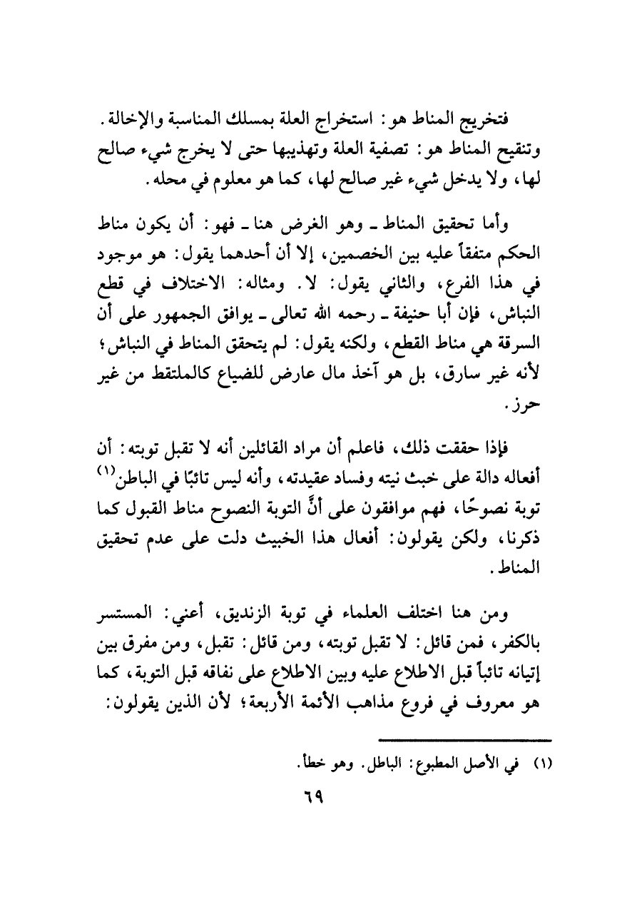 وأما تحقيق المناط -وهو الغرض هنا- فهو: أن يكون مناط الحكم متفقًا عليه بين الخصمين، إلا أن أحدهما يقول: هو موجود في هذا الفرع، والثاني يقول: لا. ومثاله: الاختلاف في قطع النباش، فإن أبا حنيفة -رحمه اللَّه تعالى- يوافق الجمهور على أن السرقة هي مناط القطع، ولكنه يقول: لم يتحقق المناط في النباش؛ لأنه غير سارق، بل هو آخذ مال عارض للضياع كالملتقط من غير حرز.