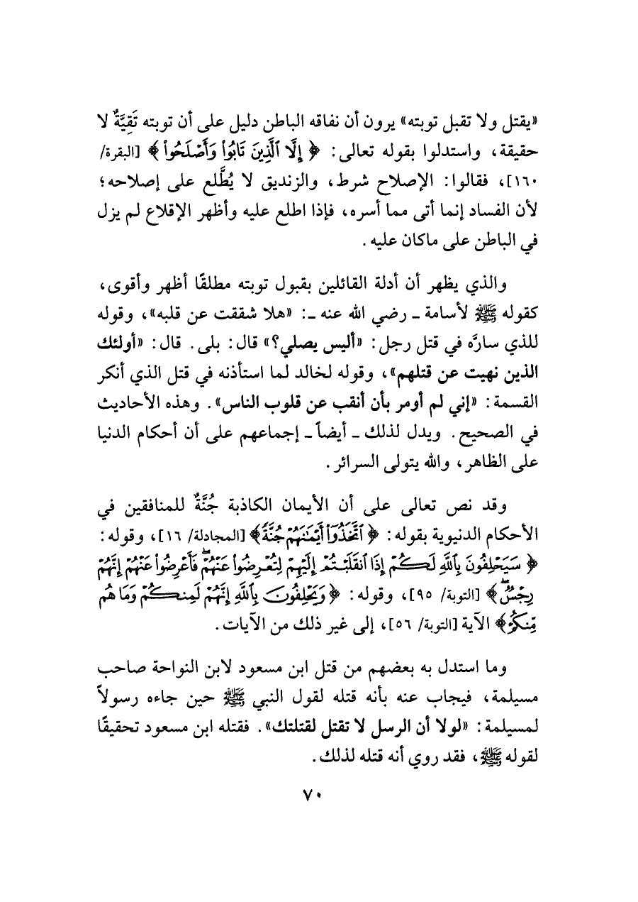 "يقتل ولا تقبل توبته" يرون أن نفاقه الباطن دليل على أن توبته تَقِيَّةٌ لا حقيقة، واستدلوا بقوله تعالى: {إِلَّا الَّذِينَ تَابُوا وَأَصْلَحُوا} [البقرة/ ١٦٠]، فقالوا: الإصلاح شرط، والزنديق لا يُطَّلع على إصلاحه؛ لأن الفساد إنما أتى مما أسره، فإذا اطلع عليه وأظهر الإقلاع لم يزل في الباطن على ما كان عليه.