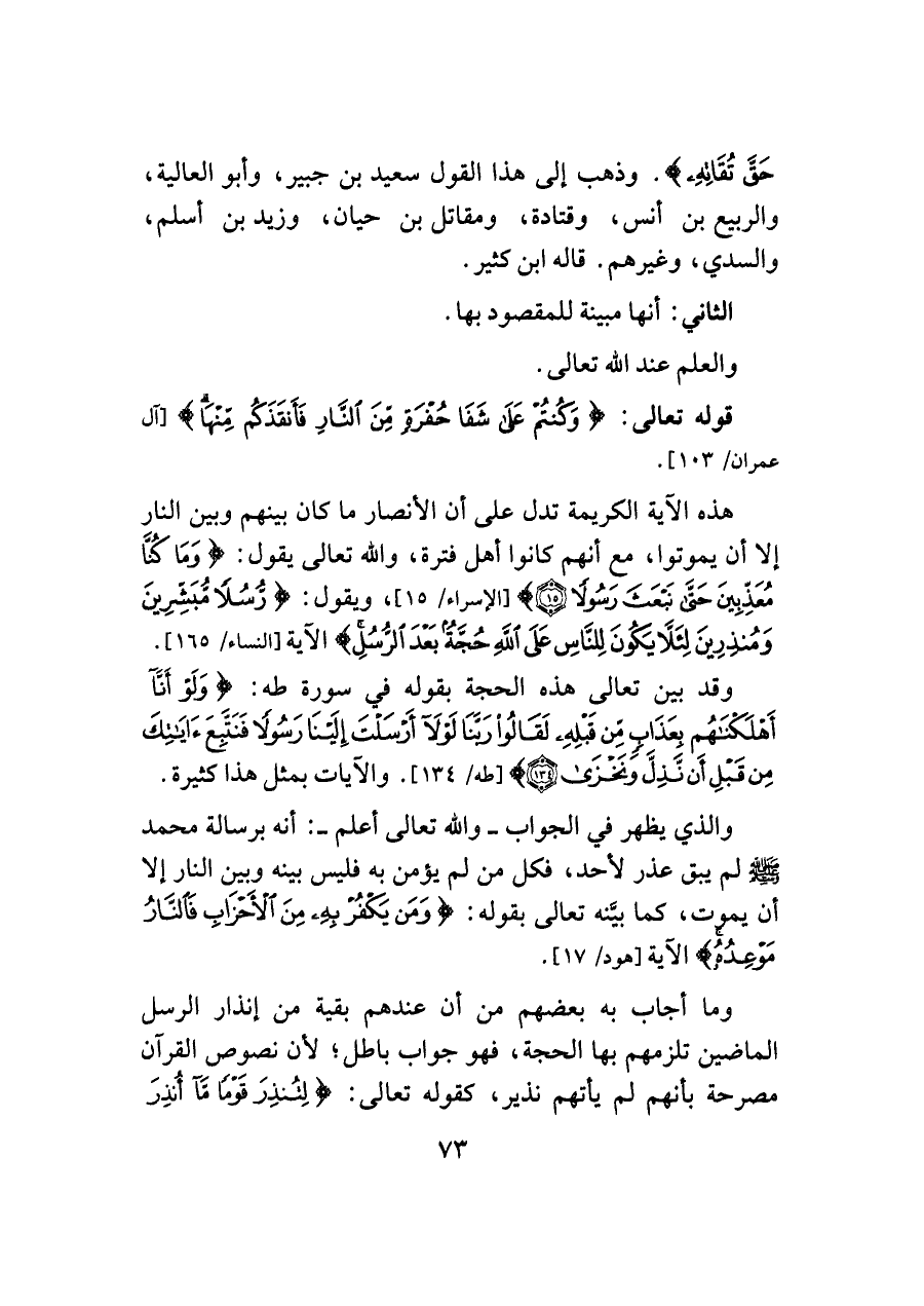 هذه الآية الكريمة تدل على أن الأنصار ما كان بينهم وبين النار إلا أن يموتوا، مع أنهم كانوا أهل فترة، واللَّه تعالى يقول: {وَمَا كُنَّا مُعَذِّبِينَ حَتَّى نَبْعَثَ رَسُولًا (١٥)} [الإسراء/ ١٥]، ويقول: {رُسُلًا مُبَشِّرِينَ وَمُنْذِرِينَ لِئَلَّا يَكُونَ لِلنَّاسِ عَلَى اللَّهِ حُجَّةٌ بَعْدَ الرُّسُلِ} الآية [النساء/ ١٦٥].