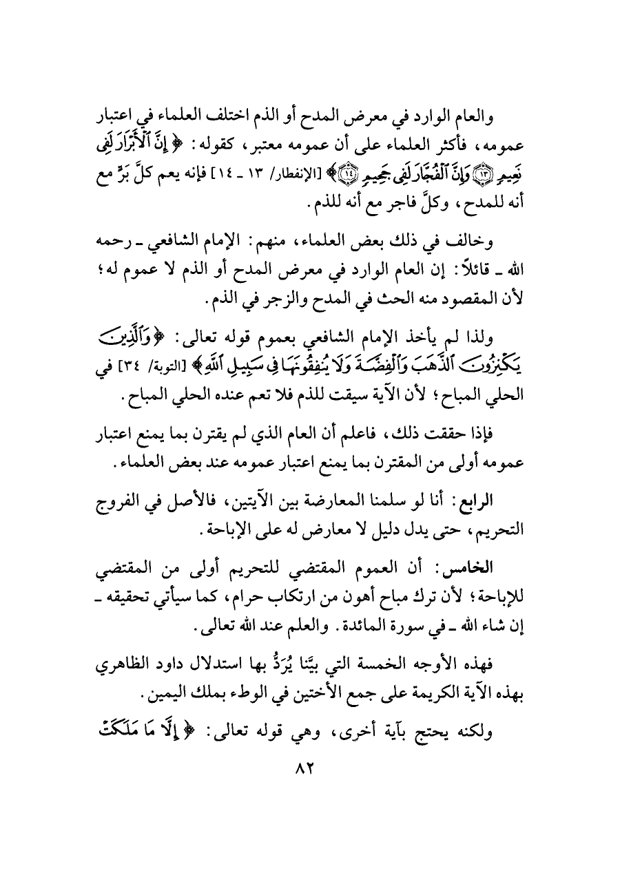 الخامس: أن العموم المقتضي للتحريم أولى من المقتضي للإباحة؛ لأن ترك مباح أهون من ارتكاب حرام، كما سيأتي تحقيقه -إن شاء اللَّه- في سورة المائدة. والعلم عند اللَّه تعالى.