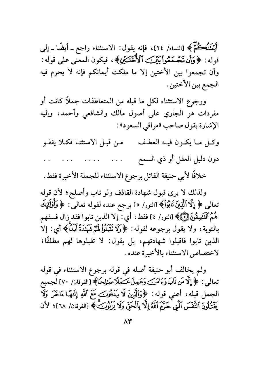 ولم يخالف أبو حنيفة أصله في قوله برجوع الاستثناء في قوله تعالى: {إِلَّا مَنْ تَابَ وَآمَنَ وَعَمِلَ عَمَلًا صَالِحًا} [الفرقان/ ٧٠] لجميع الجمل قبله، أعني قوله: {وَالَّذِينَ لَا يَدْعُونَ مَعَ اللَّهِ إِلَهًا آخَرَ وَلَا يَقْتُلُونَ النَّفْسَ الَّتِي حَرَّمَ اللَّهُ إِلَّا بِالْحَقِّ وَلَا يَزْنُونَ} [الفرقان/ ٦٨]؛ لأن