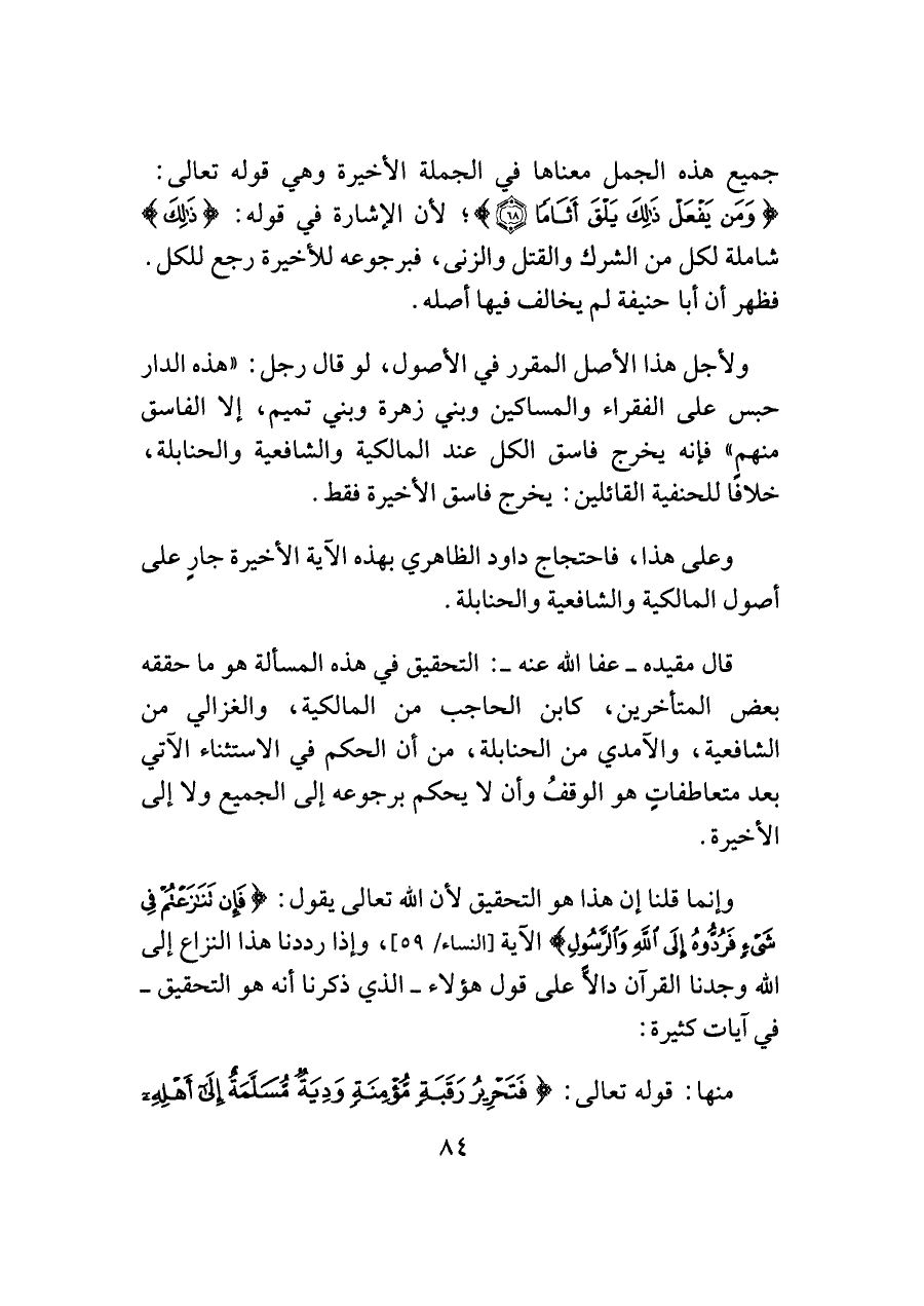 وإنما قلنا إن هذا هو التحقيق لأن اللَّه تعالى يقول: {فَإِنْ تَنَازَعْتُمْ فِي شَيْءٍ فَرُدُّوهُ إِلَى اللَّهِ وَالرَّسُولِ} الآية [النساء/ ٥٩]، وإذا رددنا هذا النزاع إلى اللَّه وجدنا القرآن دالًّا على قول هؤلاء -الذي ذكرنا أنه هو التحقيق- في آيات كثيرة: