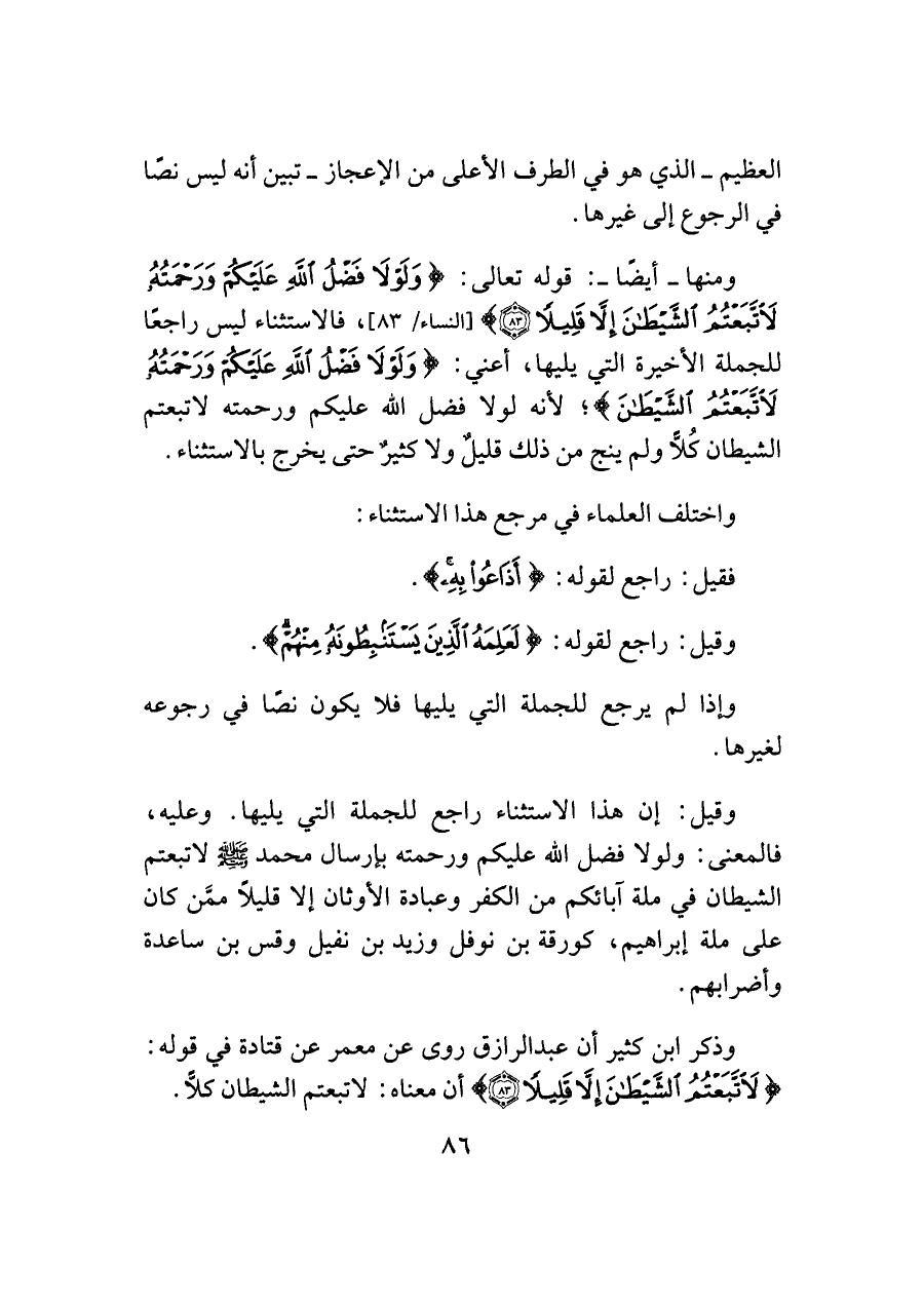 ومنها -أيضًا-: قوله تعالى: {وَلَوْلَا فَضْلُ اللَّهِ عَلَيْكُمْ وَرَحْمَتُهُ لَاتَّبَعْتُمُ الشَّيْطَانَ إِلَّا قَلِيلًا (٨٣)} [النساء/ ٨٣]، فالاستثناء ليس راجعًا للجملة الأخيرة التي يليها، أعني: {وَلَوْلَا فَضْلُ اللَّهِ عَلَيْكُمْ وَرَحْمَتُهُ لَاتَّبَعْتُمُ الشَّيْطَانَ}؛ لأنه لولا فضل اللَّه عليكم ورحمته لاتبعتم الشيطان كُلًّا ولم ينج من ذلك قليلٌ ولا كثيرٌ حتى يخرج بالاستثناء.
