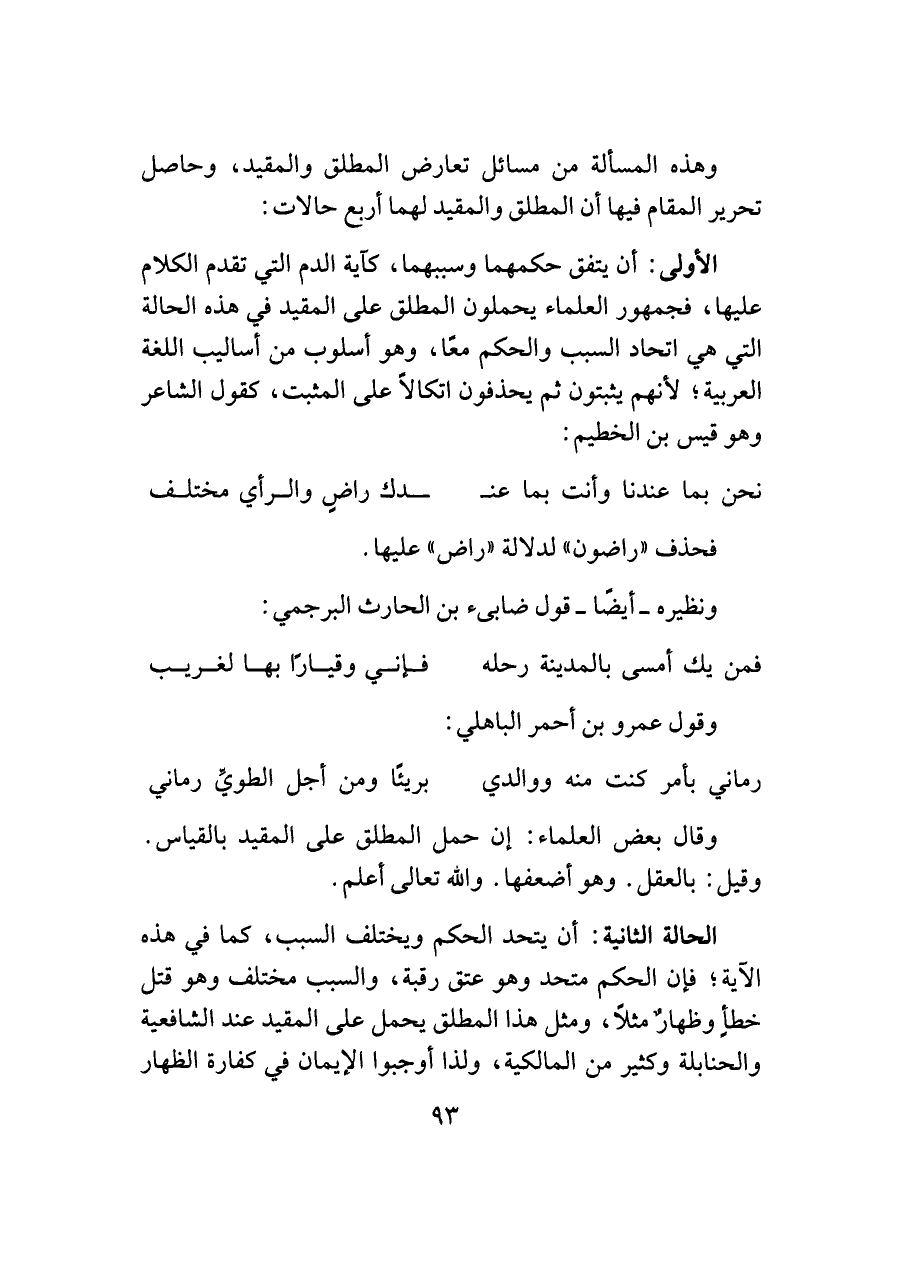 الأولى: أن يتفق حكمهما وسببهما، كآية الدم التي تقدم الكلام عليها، فجمهور العلماء يحملون المطلق على المقيد في هذه الحالة التي هي اتحاد السبب والحكم معًا، وهو أسلوب من أساليب اللغة العربية؛ لأنهم يثبتون ثم يحذفون اتكالًا على المثبت، كقول الشاعر وهو قيس بن الخطيم: