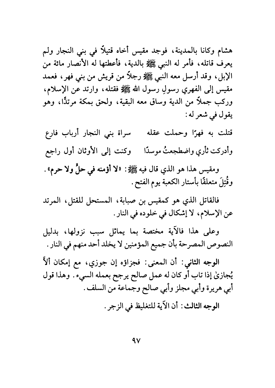 هشام وكانا بالمدينة، فوجد مقيس أخاه قتيلًا في بني النجار ولم يعرف قاتله، فأمر له النبي -صلى اللَّه عليه وسلم- بالدية، فأعطتها له الأنصار مائة من الإبل، وقد أرسل معه النبي -صلى اللَّه عليه وسلم- رجلًا من قريش من بني فهر، فعمد مقيس إلى الفهري رسولِ رسول اللَّه -صلى اللَّه عليه وسلم- فقتله، وارتد عن الإسلام، وركب جملًا من الدية وساق معه البقية، ولحق بمكة مرتدًّا، وهو يقول في شعر له: