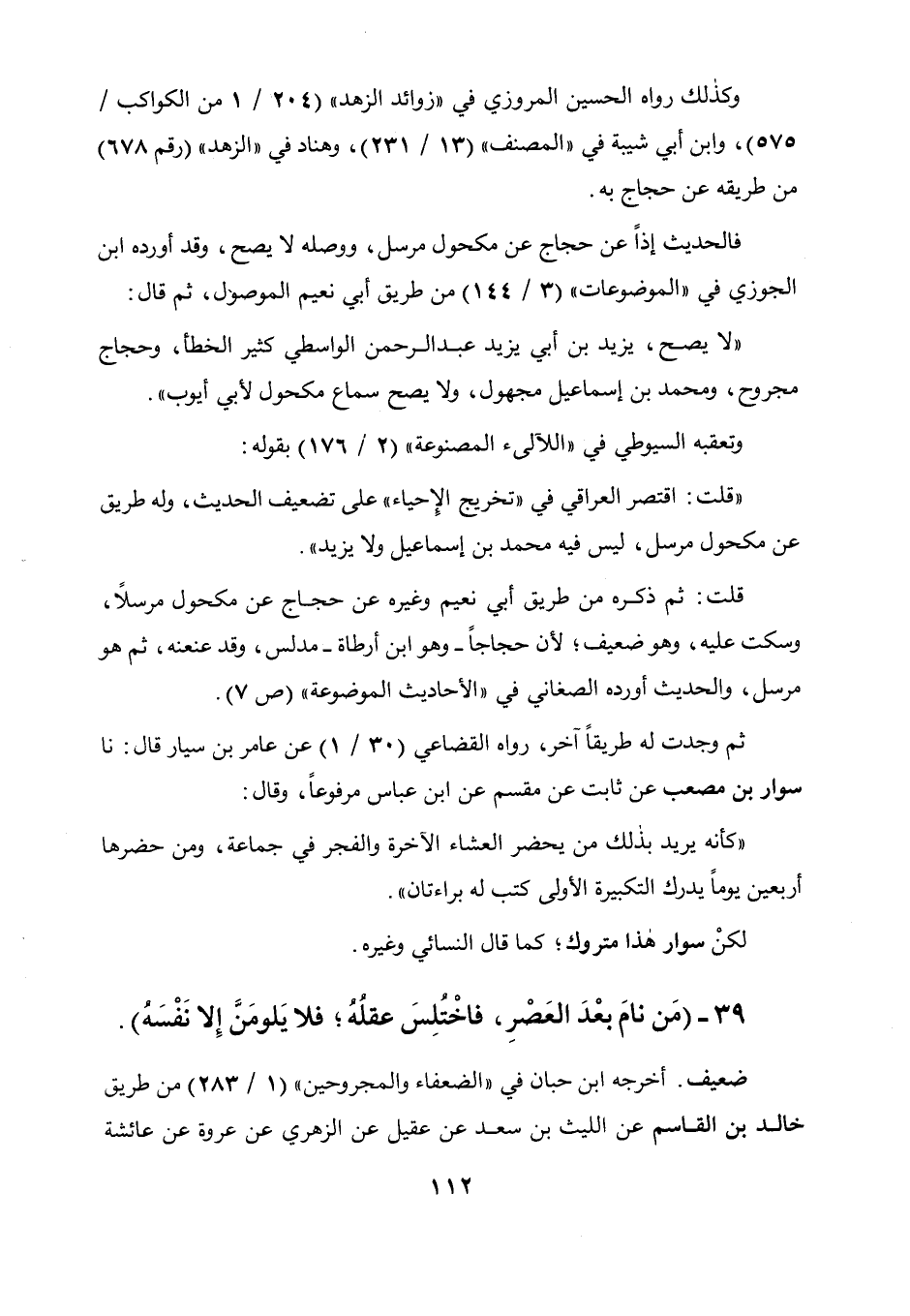 39 - " من نام بعد العصر فاختلس عقله فلا يلومن إلا نفسه ".