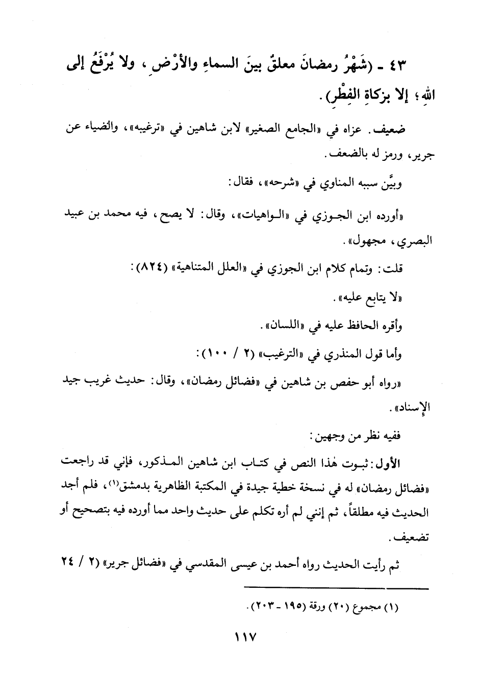 الأول: ثبوت هذا النص في كتاب ابن شاهين المذكور، فإنى قد راجعت " فضائل رمضان " له في نسخة خطية جيدة في المكتبة الظاهرية بدمشق، فلم أجد الحديث فيه مطلقا، ثم إننى لم أره تكلم على حديث واحد مما أورده فيه بتصحيح أو تضعيف.