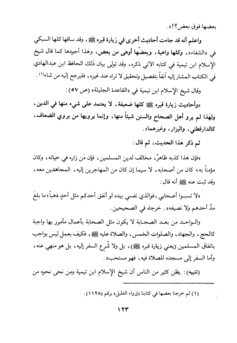 واعلم أنه قد جاءت أحاديث أخرى في زيارة قبره صلى الله عليه وسلم وقد ساقها كلها السبكي في " الشفاء " وكلها واهية وبعضها أو هى من بعض، وهذا أجودها كما قال شيخ الإسلام ابن تيمية في كتابه الآتي ذكره، وقد تولى بيان ذلك الحافظ ابن عبد الهادي في الكتاب المشار إليه آنفا بتفصيل وتحقيق لا تراه عند غيره فليرجع إليه من شاء.