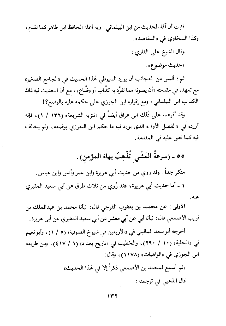 فثبت أن آفة الحديث من ابن البيلماني وبه أعله الحافظ ابن طاهر كما تقدم، وكذا السخاوي في " المقاصد "، وقال الشيخ علي القاري: حديث موضوع.