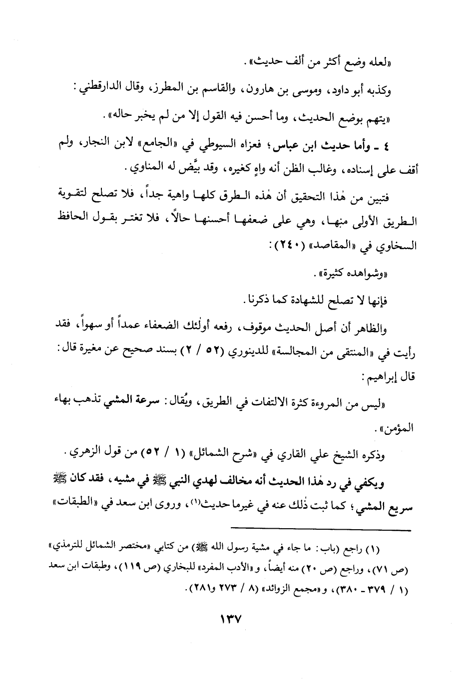 ويكفي في رد هذا الحديث أنه مخالف لهدي النبي صلى الله عليه وسلم في مشيه، فقد كان صلى الله عليه وسلم سريع المشي كما ثبت ذلك عنه في غير ما حديث، وروى ابن سعد في " الطبقات "