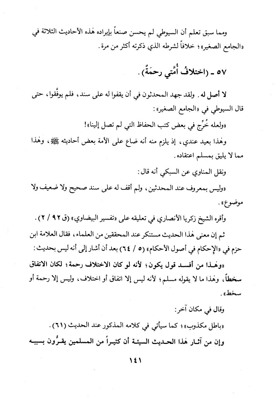 وهذا من أفسد قول يكون، لأنه لوكان الاختلاف رحمة لكان الاتفاق سخطا، وهذا ما لا يقوله مسلم، لأنه ليس إلا اتفاق أو اختلاف، وليس إلا رحمة أوسخط.