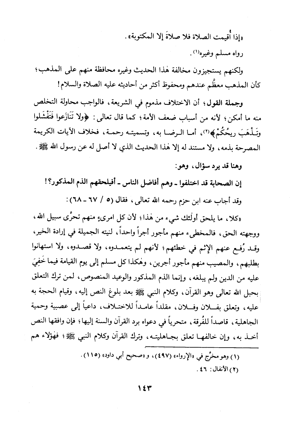 وقد أجاب عنه ابن حزم رحمه الله تعالى فقال (5 / 67 - 68) : كلا ما يلحق أولئك شيء من هذا، لأن كل امرئ منهم تحرى سبيل الله، ووجهته الحق، فالمخطئ منهم مأجور أجرا واحدا لنيته الجميلة في إرادة الخير، وقد رفع عنهم الإثم في خطئهم لأنهم لم يتعمدوه ولا قصدوه ولا استهانوا بطلبهم، والمصيب منهم مأجور أجرين، وهكذا كل مسلم إلى يوم القيامة فيما خفي عليه من الدين ولم يبلغه، وإنما الذم المذكور والوعيد المنصوص، لمن ترك التعلق بحبل الله تعالى وهو القرآن، وكلام النبي صلى الله عليه وسلم بعد بلوغ النص إليه وقيام الحجة به عليه، وتعلق بفلان وفلان، مقلدا عامدا للاختلاف، داعيا إلى عصبية وحمية الجاهلية، قاصدا للفرقة، متحريا في دعواه برد القرآن