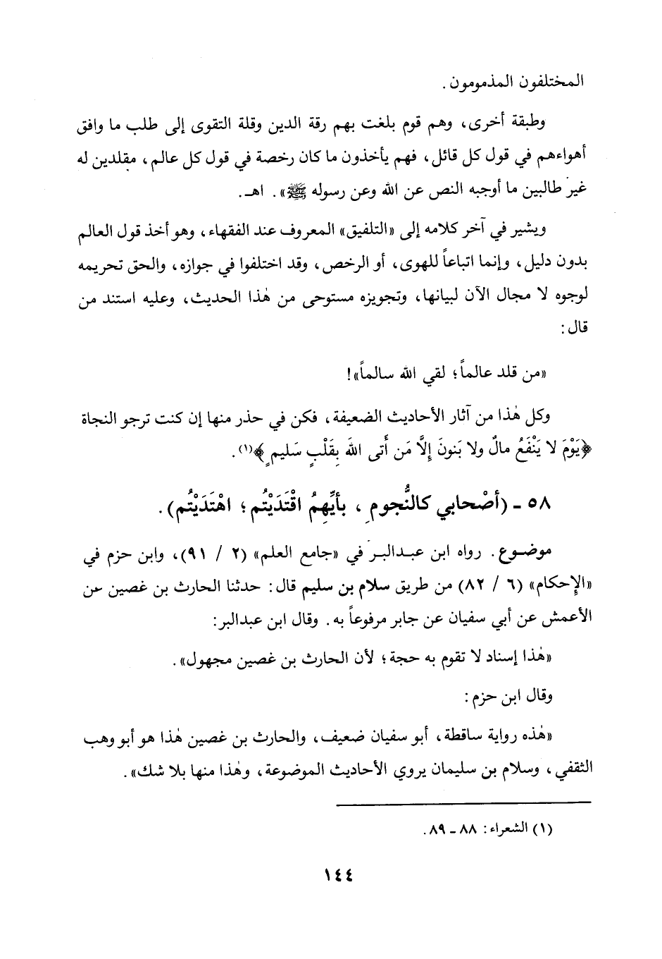 وعليه استند من قال: " من قلد عالما لقي الله سالما "! وكل هذا من آثار الأحاديث الضعيفة، فكن في حذر منها إن كنت ترجوالنجاة {يوم لا ينفع مال ولا بنون إلا من أتى الله بقلب سليم} .