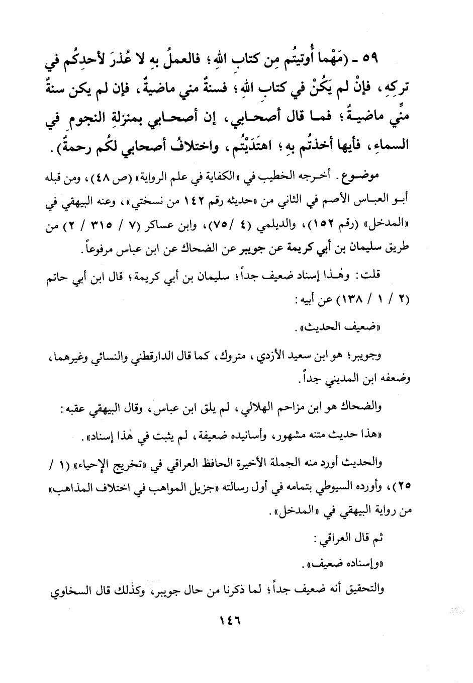 59 - " مهما أوتيتم من كتاب الله فالعمل به، لا عذر لأحدكم في تركه، فإن لم يكن في كتاب الله، فسنة مني ماضية، فإن لم يكن سنة مني ماضية، فما قال أصحابي، إن أصحابي بمنزلة النجوم في السماء، فأيها أخذتم به اهتديتم، واختلاف أصحابي لكم رحمة ".