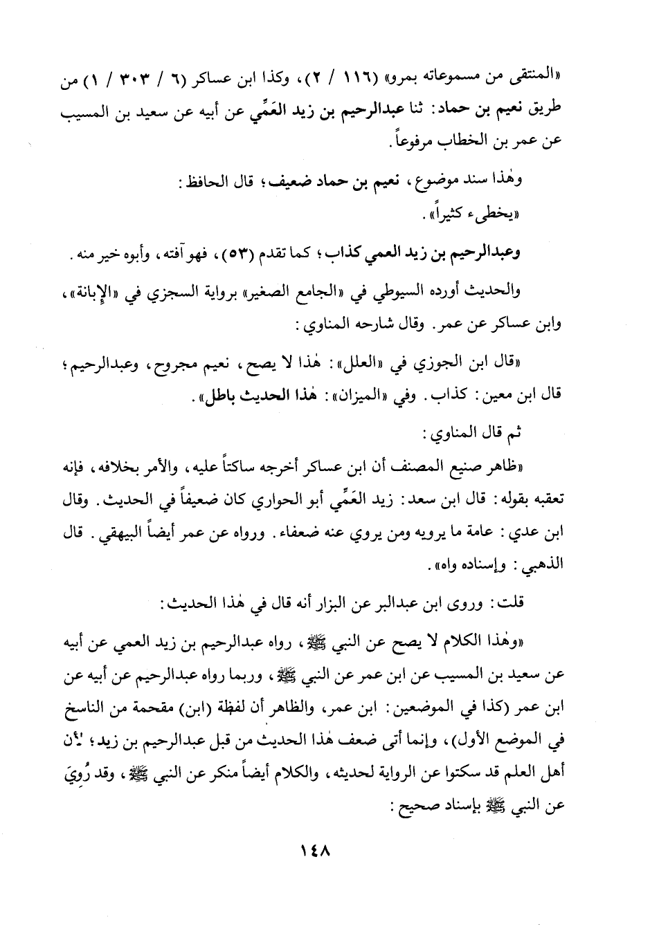 قلت: وروى ابن عبد البر عن البزار أنه قال في هذا الحديث: وهذا الكلام لا يصح عن النبي صلى الله عليه وسلم، رواه عبد الرحيم بن زيد العمي عن أبيه عن سعيد بن المسيب عن ابن عمر عن النبي صلى الله عليه وسلم، وربما رواه عبد الرحيم عن أبيه عن ابن عمر، كذا في الموضعين: ابن عمر، والظاهر أن لفظة (ابن) مقحمة من الناسخ في الموضع الأول وإنما أتى ضعف هذا الحديث من قبل عبد الرحيم بن زيد، لأن أهل العلم قد سكتوا عن الرواية لحديثه، والكلام أيضا منكر عن النبي صلى الله عليه وسلم، وقد روي عن النبي صلى الله عليه وسلم بإسناد صحيح: