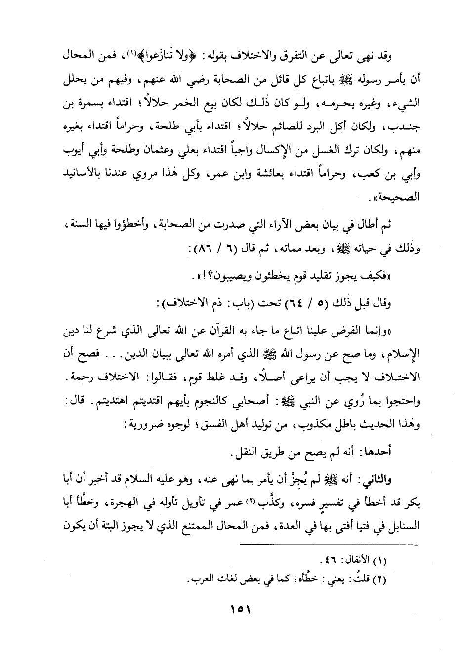 وقد نهى تعالى عن التفرق والاختلاف بقوله: {ولا تنازعوا} ،فمن المحال أن يأمر رسوله صلى الله عليه وسلم باتباع كل قائل من الصحابة رضي الله عنهم وفيهم من يحلل الشيء، وغيره يحرمه، ولوكان ذلك لكان بيع الخمر حلالا اقتداء بسمرة بن جندب، ولكان أكل البرد للصائم حلالا اقتداء بأبي طلحة، وحراما اقتداء بغيره منهم، ولكان ترك الغسل من الإكسال واجبا بعلي وعثمان وطلحة وأبي أيوب وأبي بن كعب وحراما اقتداء بعائشة وابن عمر وكل هذا مروى عندنا بالأسانيد الصحيحة.