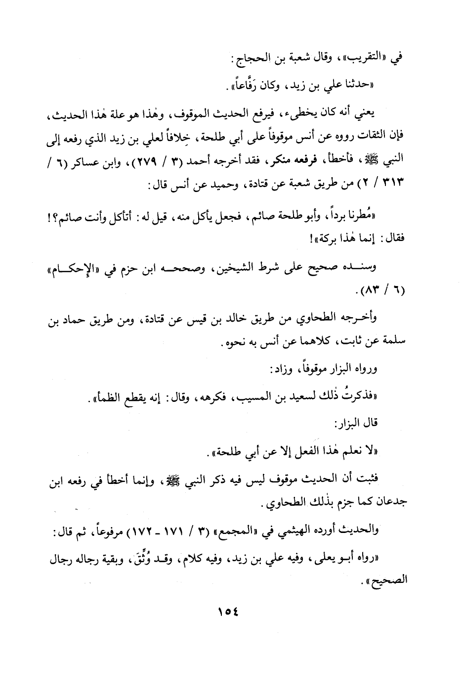في " التقريب "، وقال شعبة بن الحجاج: حدثنا علي بن زيد وكان رفاعا يعني أنه كان يخطيء فيرفع الحديث الموقوف وهذا هو علة هذا الحديث، فإن الثقات رووه عن أنس موقوفا على أبي طلحة خلافا لعلى بن زيد الذي رفعه إلى النبي صلى الله عليه وسلم فأخطأ، فرفعه منكر، فقد أخرجه أحمد (3 / 279) وابن عساكر (6 / 313 /2) من طريق شعبة عن قتادة وحميد عن أنس قال: مطرنا بردا وأبو طلحة صائم فجعل يأكل منه، قيل له: أتأكل وأنت صائم؟ ! فقال: إنما هذا بركة! وسنده صحيح على شرط الشيخين، وصححه ابن حزم في " الإحكام " (6 / 83) وأخرجه الطحاوي من طريق خالد بن قيس عن قتادة، ومن طريق حماد بن سلمة عن ثابت، كلاهما عن أنس به نحوه، ورواه البزار موقوفا وزاد: فذكرت ذلك لسعيد بن المسيب فكرهه، وقال: إنه يقطع الظمأ، قال البزار: لا نعلم هذا الفعل إلا عن أبي طلحة، فثبت أن الحديث موقوف ليس فيه ذكر النبي صلى الله عليه وسلم، وإنما أخطأ في رفعه ابن جدعان كما جزم بذلك الطحاوي.