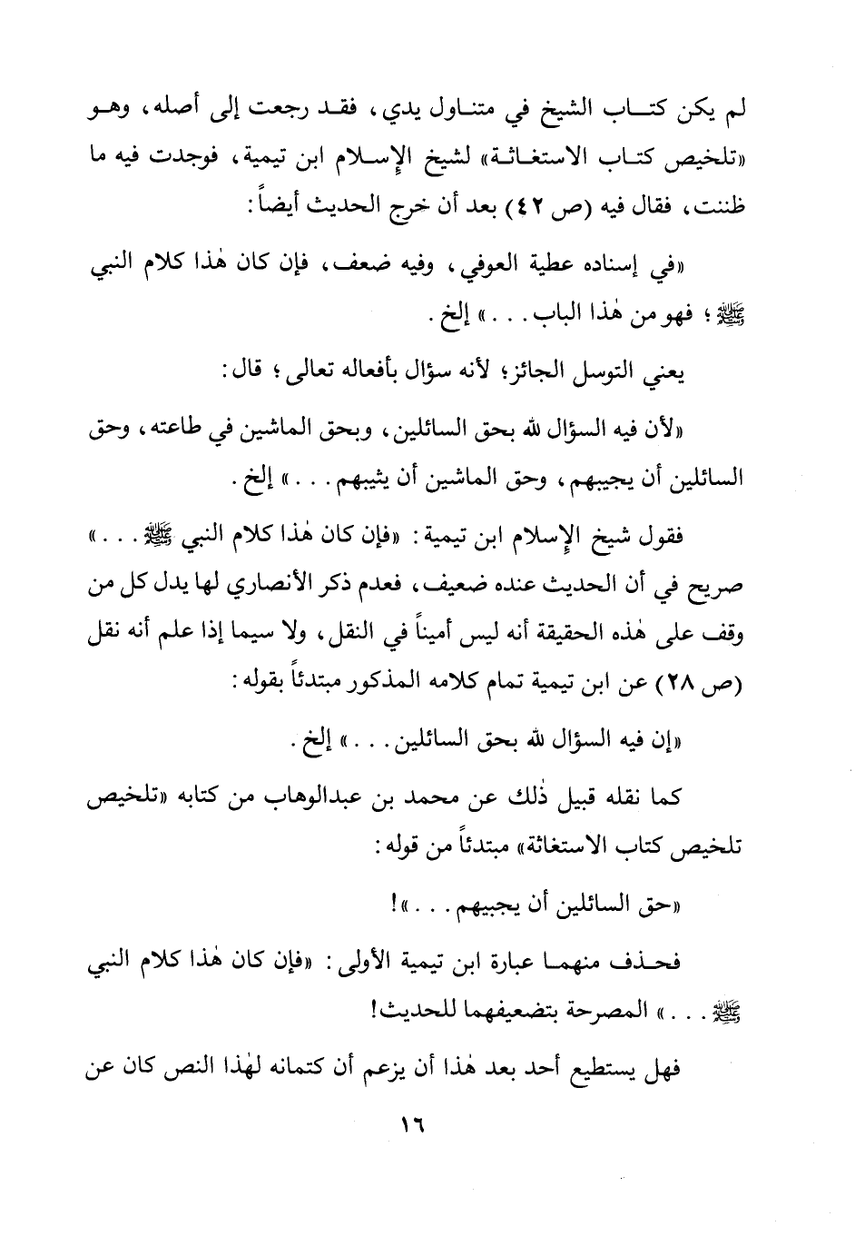 كما نقله قبيل ذلك عن محمد بن عبد الوهاب من كتابه "تلخيص تلخيص كتاب الاستغاثة" مبتدئاً من قوله: