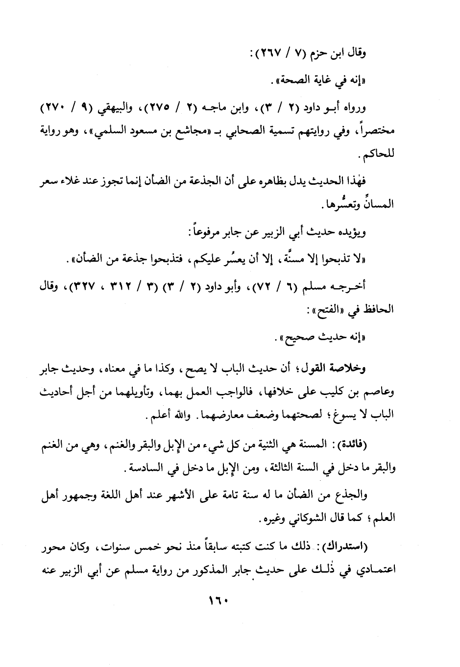 وقال ابن حزم (7 / 267) : إنه في غاية الصحة، ورواه أبو داود (2 / 3) وابن ماجه (2 / 275) والبيهقي (9 / 270) مختصرا، وفي روايتهم تسمية الصحابي بمجاشع بن مسعود السلمي وهو رواية للحاكم، فهذا الحديث يدل بظاهره على أن الجذعة من الضأن إنما تجوز عند غلاء سعر المسان وتعسرها، ويؤيده حديث أبي الزبير عن جابر مرفوعا: " لا تذبحوا إلا مسنة، إلا أن يعسر عليكم، فتذبحوا جذعة من الضأن "، أخرجه مسلم (6 / 72) وأبو داود (2 / 3) (3 / 312، 327) وقال الحافظ في " الفتح ": إنه حديث صحيح.